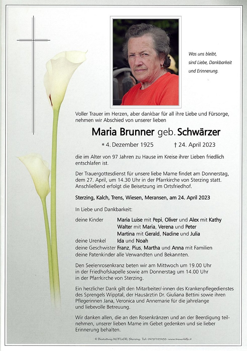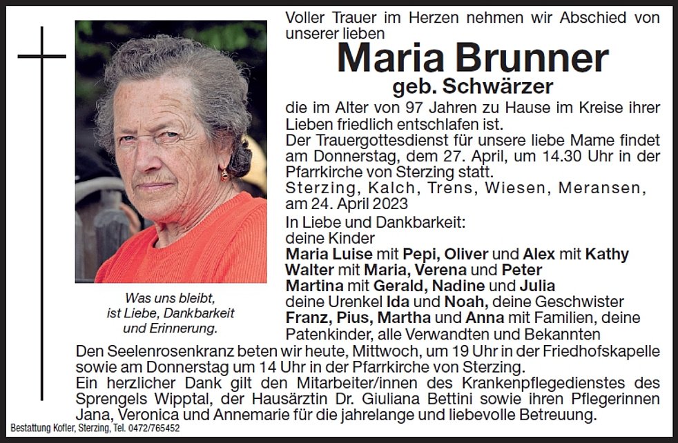 Der Trauergottesdienst für unsere liebe Mame findet am Donnerstag, dem 27. April, um 14.30 Uhr in der Pfarrkirche von Sterzing statt. Anschließend erfolgt die Beisetzung im Ortsfriedhof.