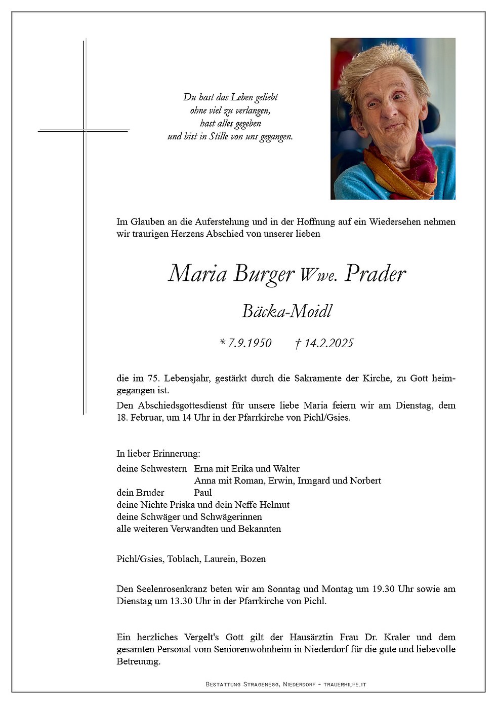 Trauerfeier: 18.02. - 14:00 Uhr Pichl/Gsies