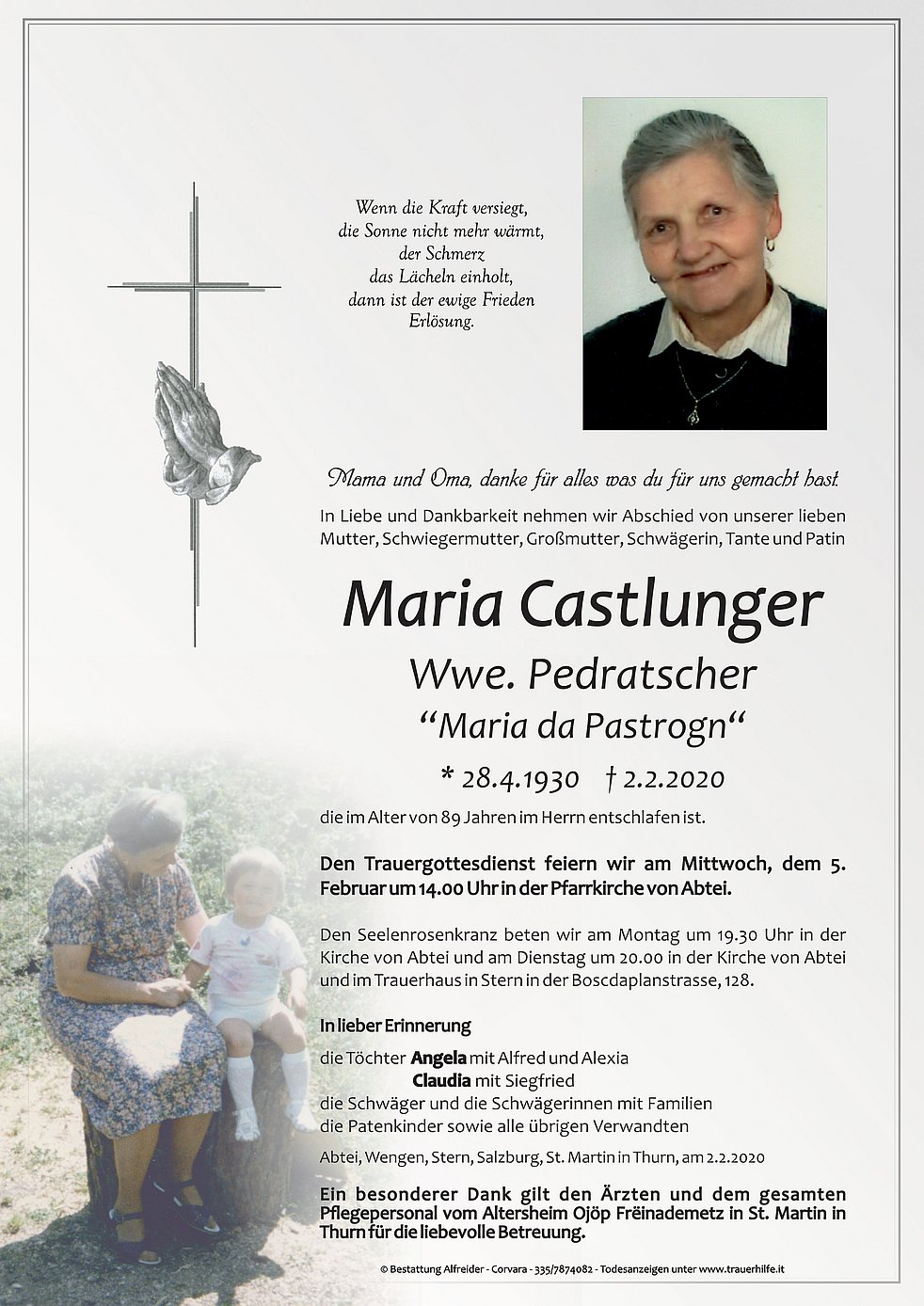 Ein besonderer Dank gilt den Ärzten und dem gesamten Pflegepersonal vom Altersheim Ojöp Frëinademetz in St. Martin in Thurn für die liebevolle Betreuung.