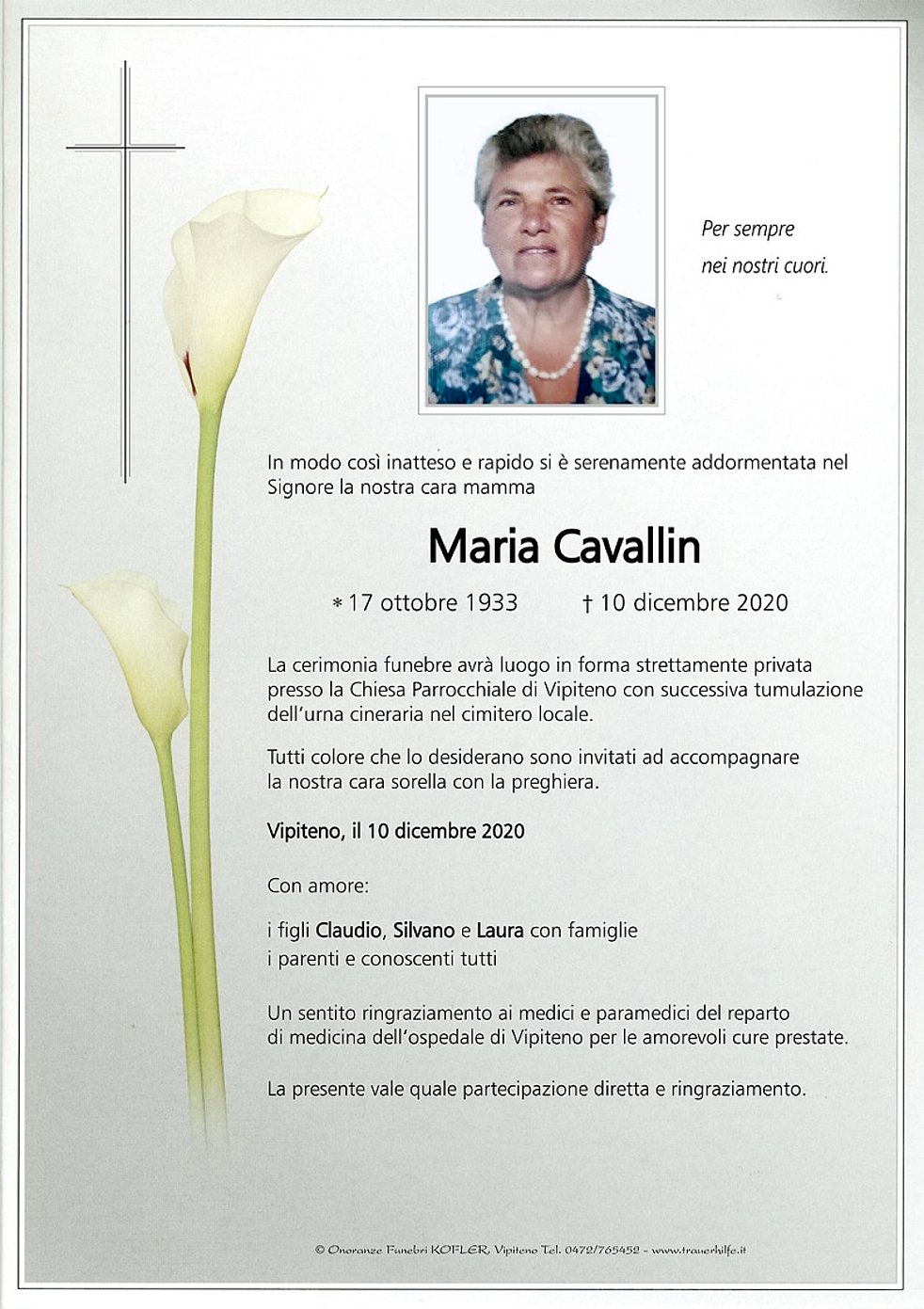 La cerimonia funebre avrà luogo in forma strettamente privata presso la Chiesa Parrocchiale di Vipiteno con successiva tumulazione dell‘urna cineraria nel cimitero locale.