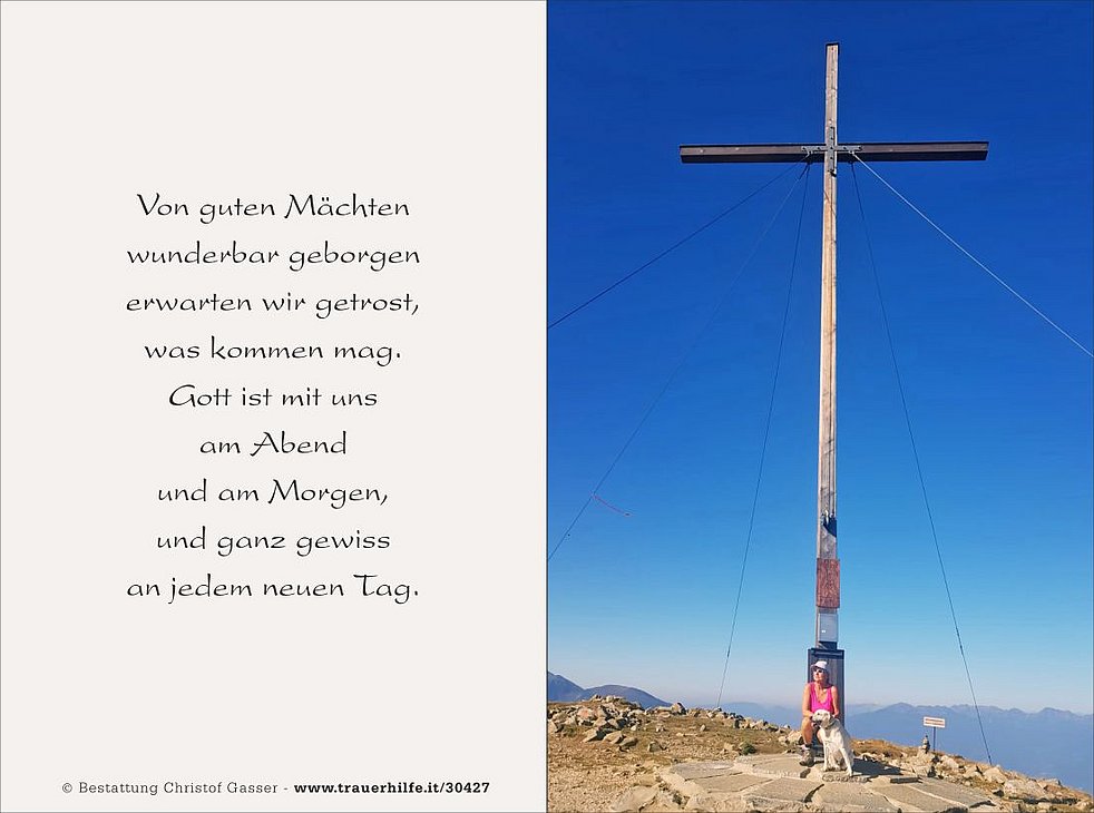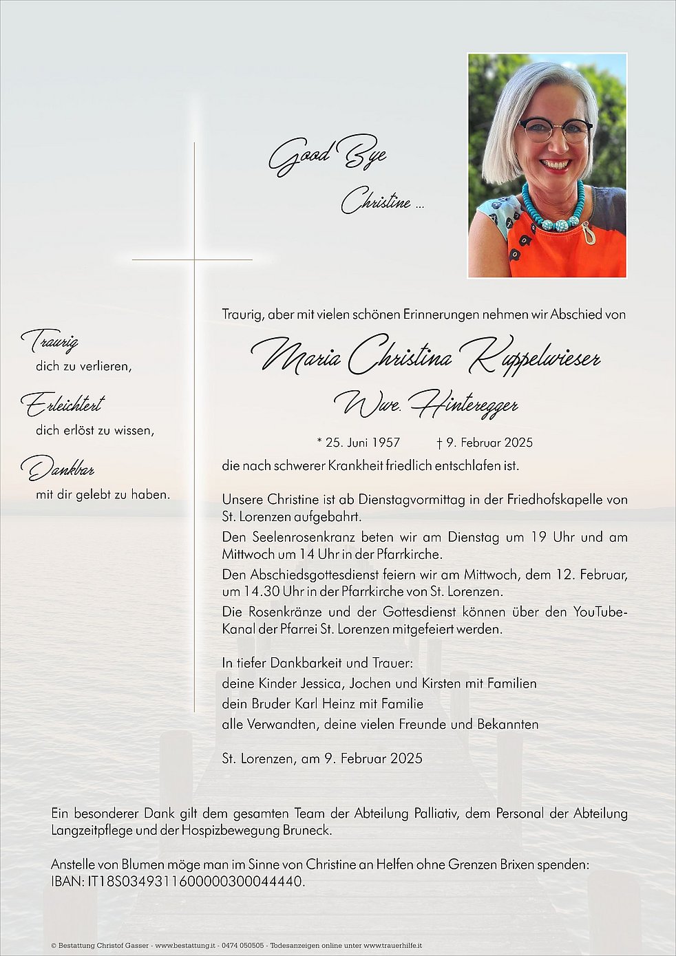 Anstelle von Blumen möge man im Sinne von Christine an Helfen ohne Grenzen Brixen spenden: IBAN: IT18S0349311600000300044440.