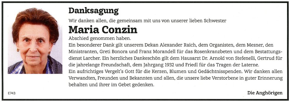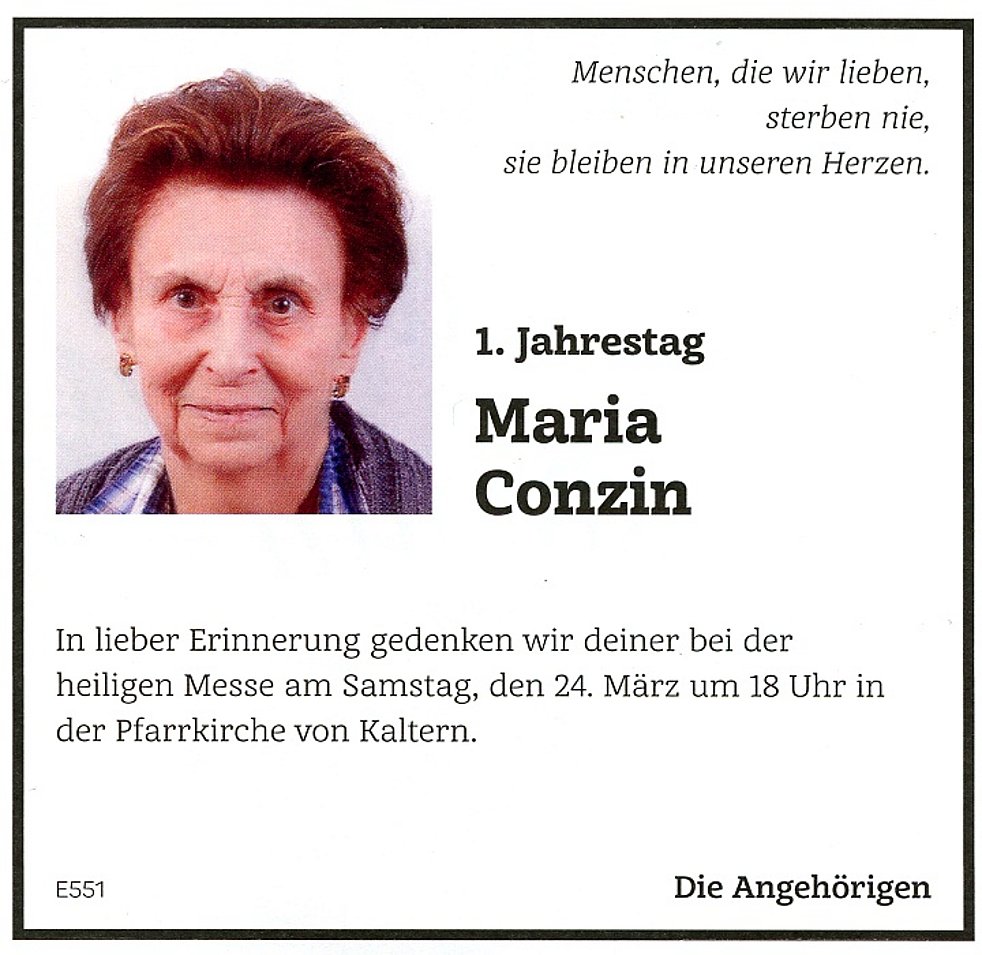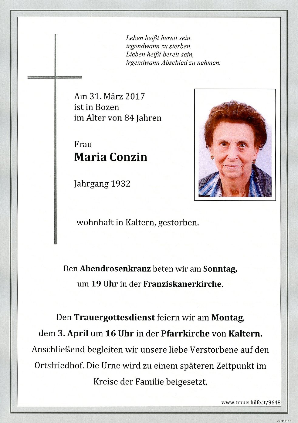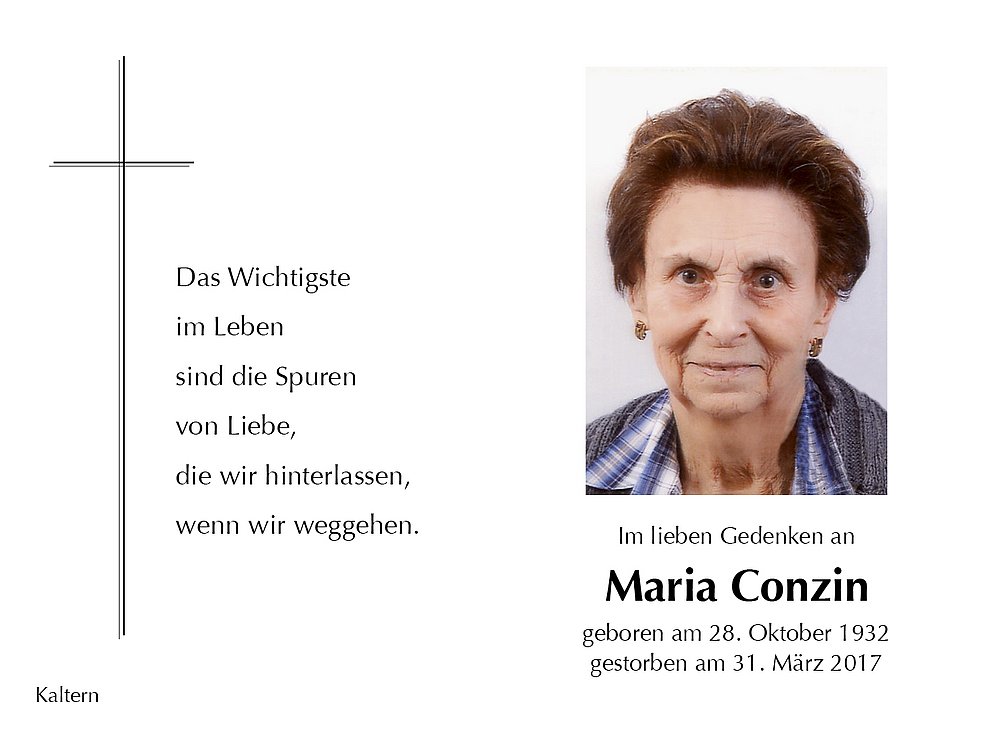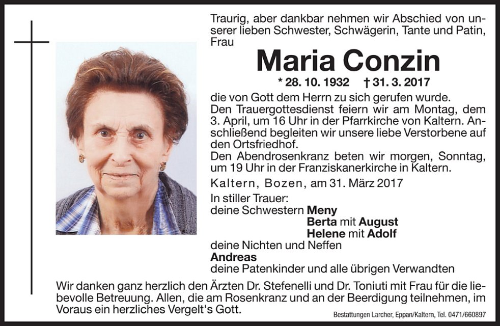 Den Trauergottesdienst feiern wir am Montag, dem 3. April 2017, um 16 Uhr in der Pfarrkirche von Kaltern. Anschließend begleiten wir unsere liebe Verstorbene auf den Ortsfriedhof.