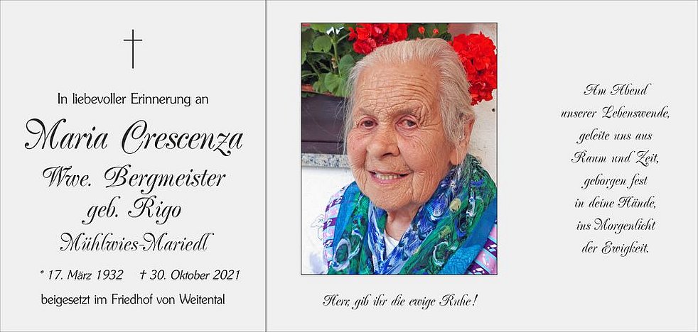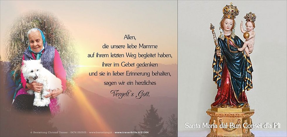 Unsere liebe Mamme ist ab Montag in der Friedhofskapelle aufgebahrt. Den Seelenrosenkranz beten wir am Dienstag um 18.30 Uhr und am Mittwoch um 14 Uhr in der Pfarrkirche von Weitental.