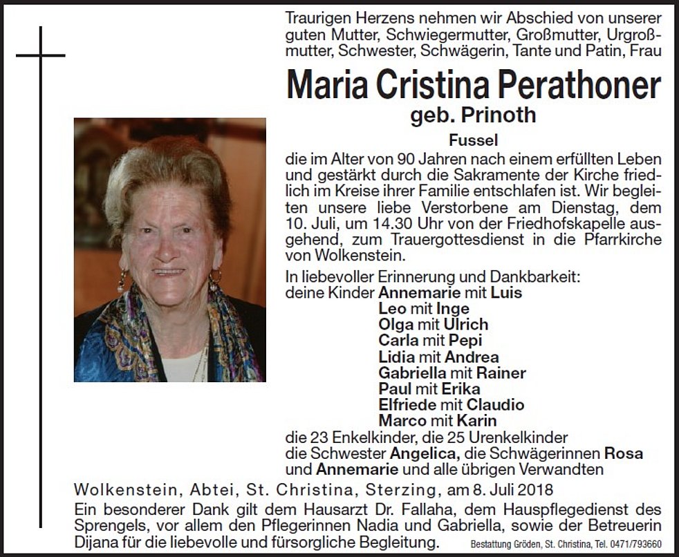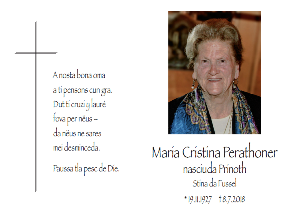 Wir begleiten unsere liebe Verstorbene am Dienstag, dem 10.Juli um 14.30 Uhr von der Friedhofskapelle ausgehend zum Trauergottesdienst in die Pfarrkirche von Wolkenstein.