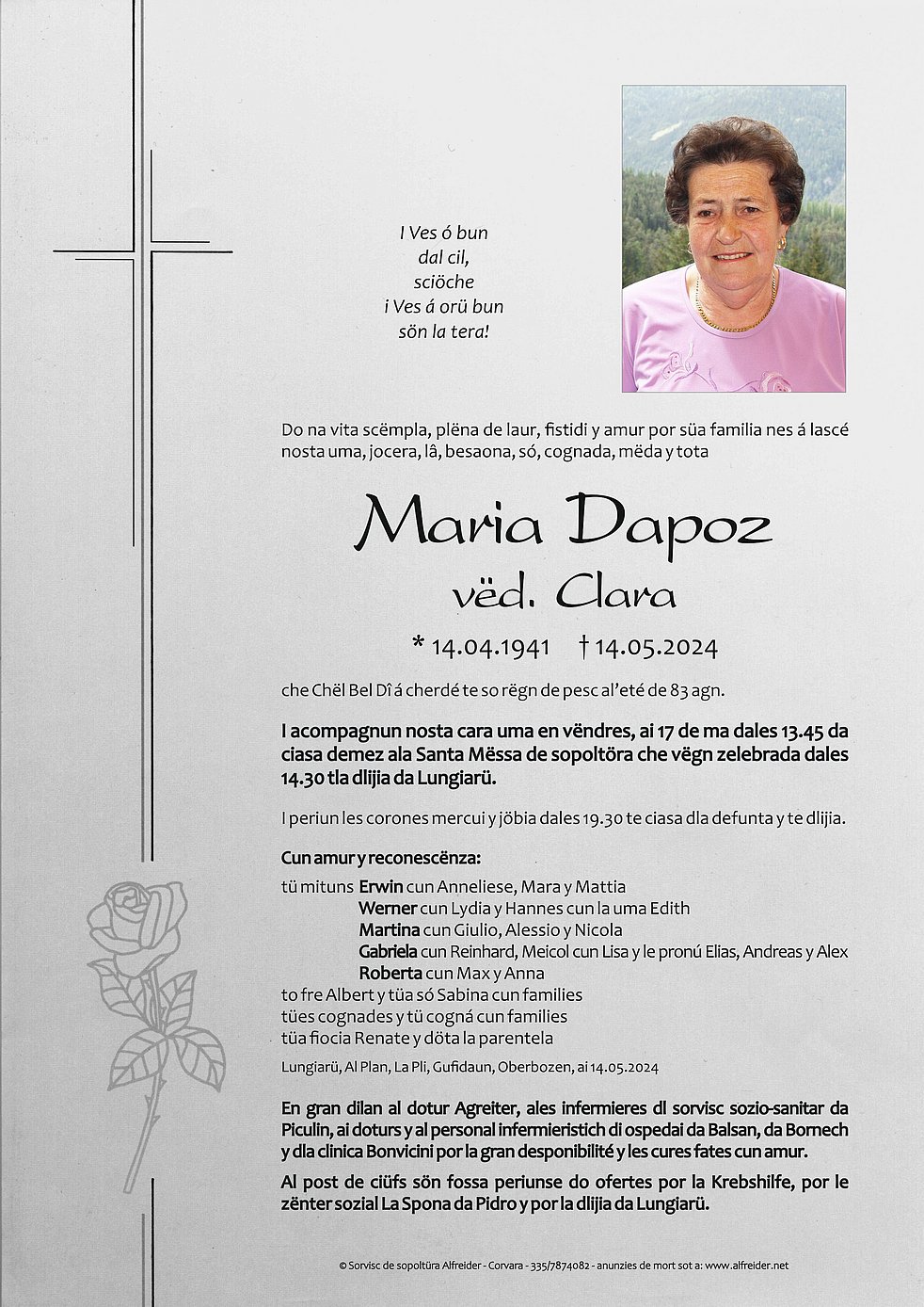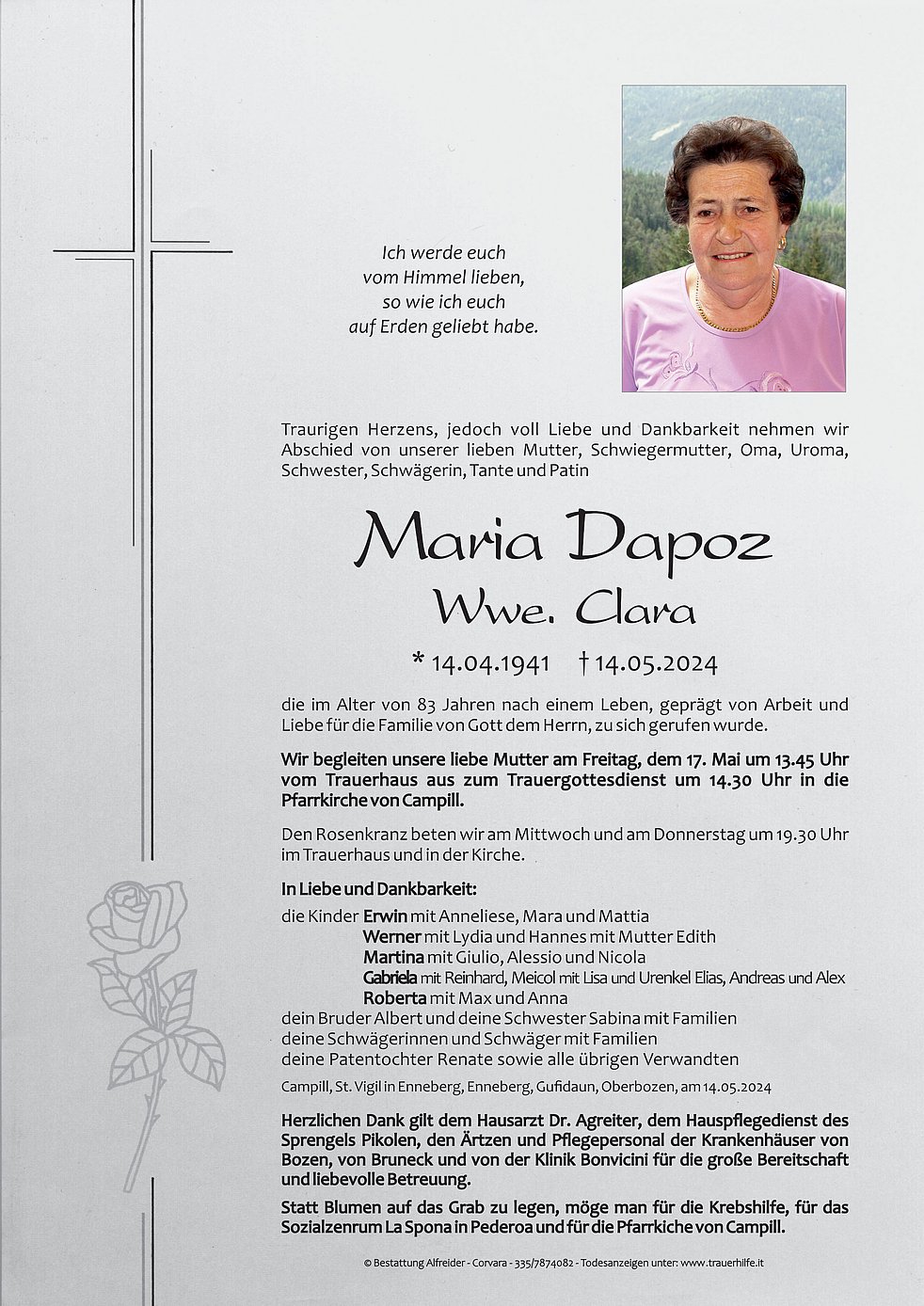 Begräbnisgottesdienst: 17.05. - 14:30 Uhr Pfarrkirche Campill