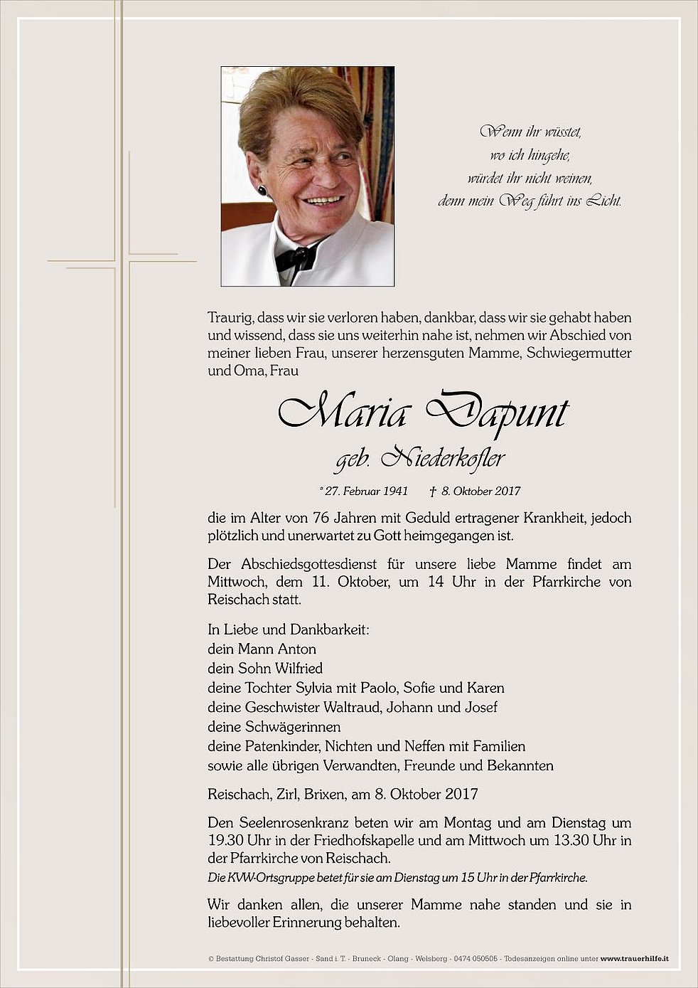 Der Abschiedsgottesdienst für unsere liebe Mamme findet am Mittwoch, dem 11. Oktober, um 14 Uhr in der Pfarrkirche von Reischach statt.