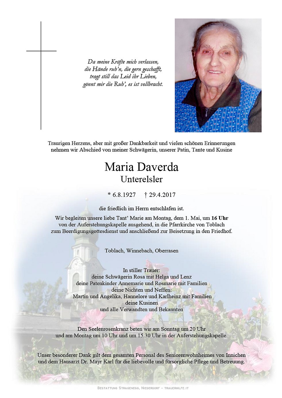 Begräbnisgottesdienst: 01.05. - 16:00 Uhr Toblach