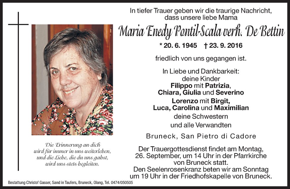 Der Trauergottesdienst findet am Montag, 26. September, um 14 Uhr in der Pfarrkirche von Bruneck statt.
