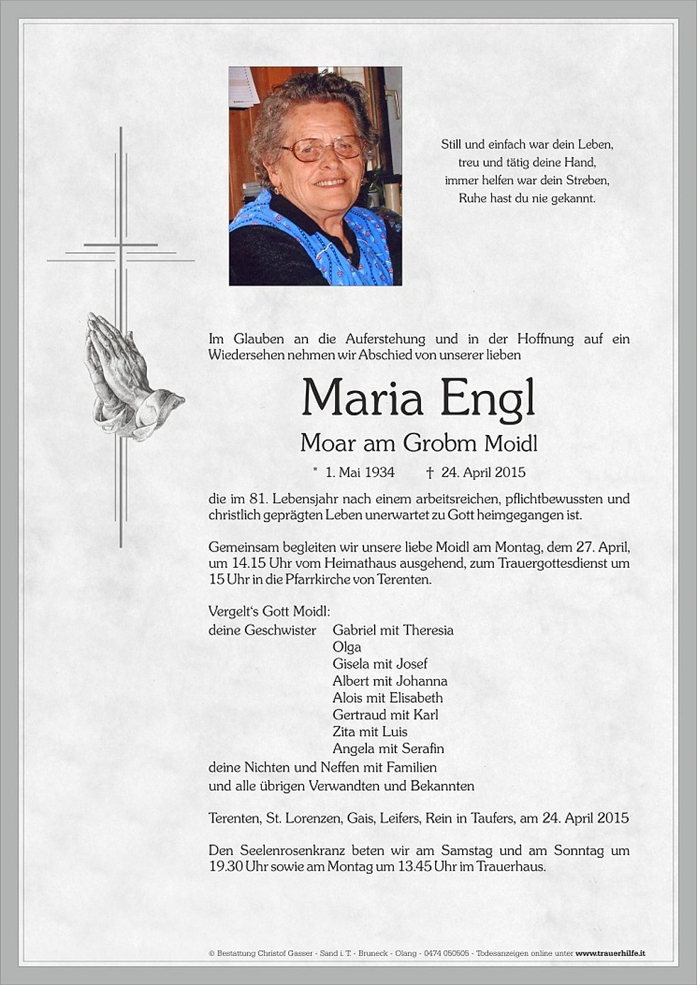Gemeinsam begleiten wir unsere liebe Moidl am Montag, dem 27. April, um 14.15 Uhr vom Heimathaus ausgehend, zum Trauergottesdienst um 15 Uhr in die Pfarrkirche von Terenten.