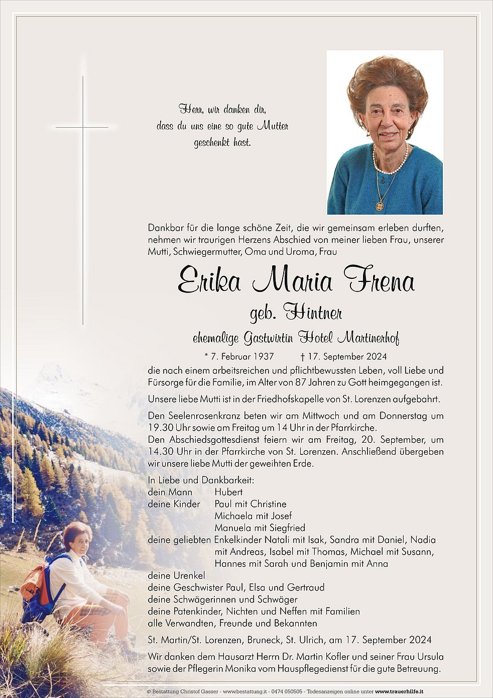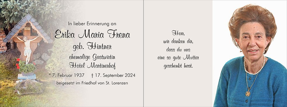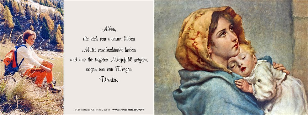 Den Abschiedsgottesdienst feiern wir am Freitag, 20. September, um 14.30 Uhr in der Pfarrkirche von St. Lorenzen. Anschließend übergeben wir unsere liebe Mutti der geweihten Erde.