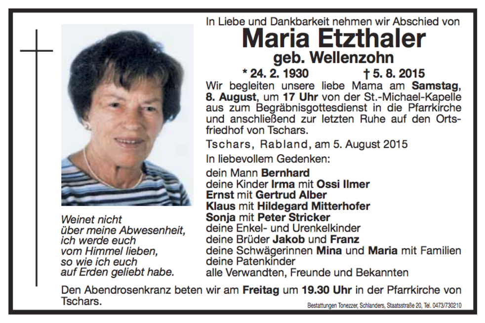 St.-Michael-Kapelle aus zum Begräbnisgottesdienst in die Pfarrkirche und anschließend zur letzten Ruhe auf den Ortsfriedhof von Tschars.