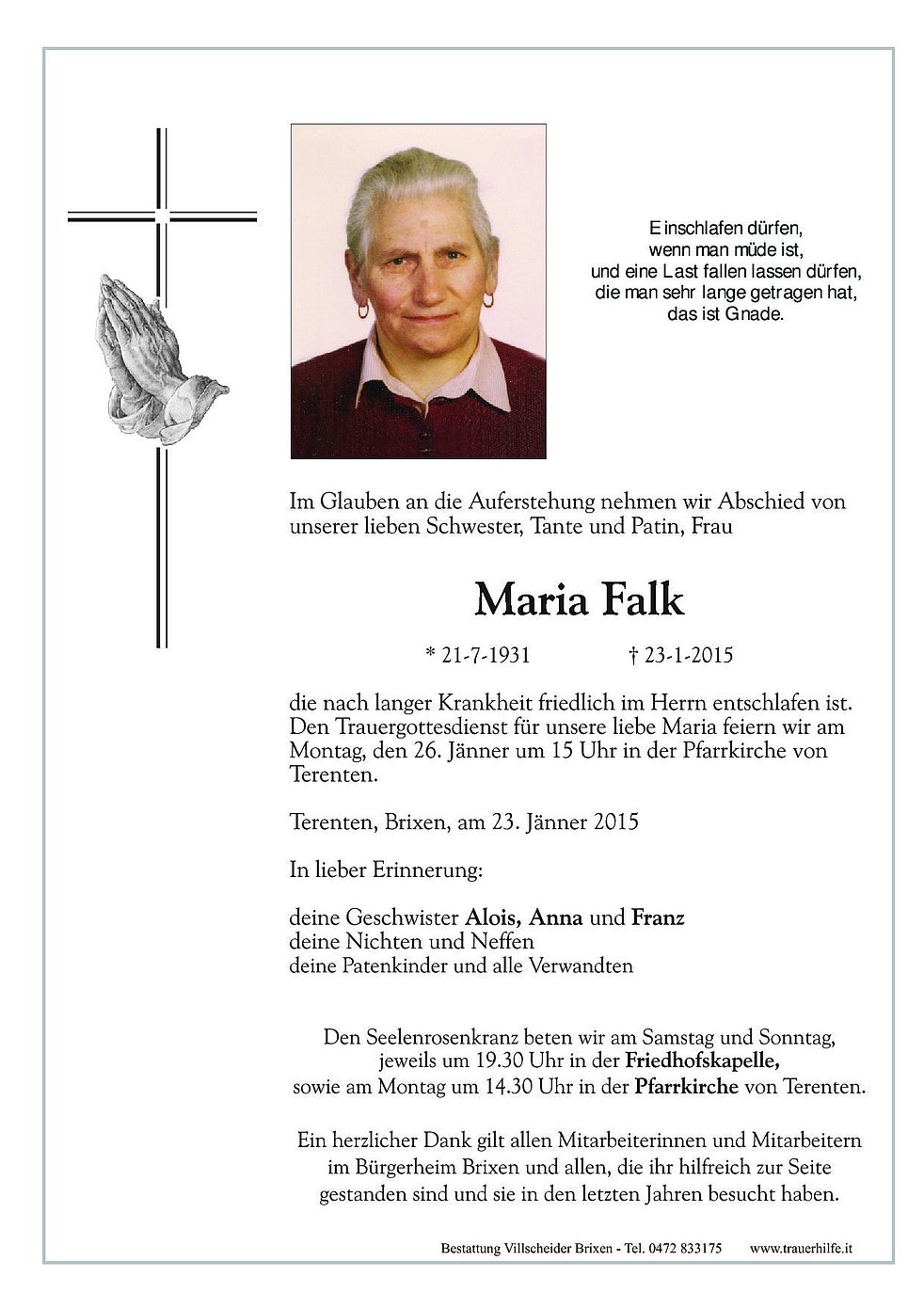 Den Trauergottesdienst für unsere liebe Maria feiern wir am Montag, den 26. Jänner um 15 Uhr in der Pfarrkirche von Terenten.
