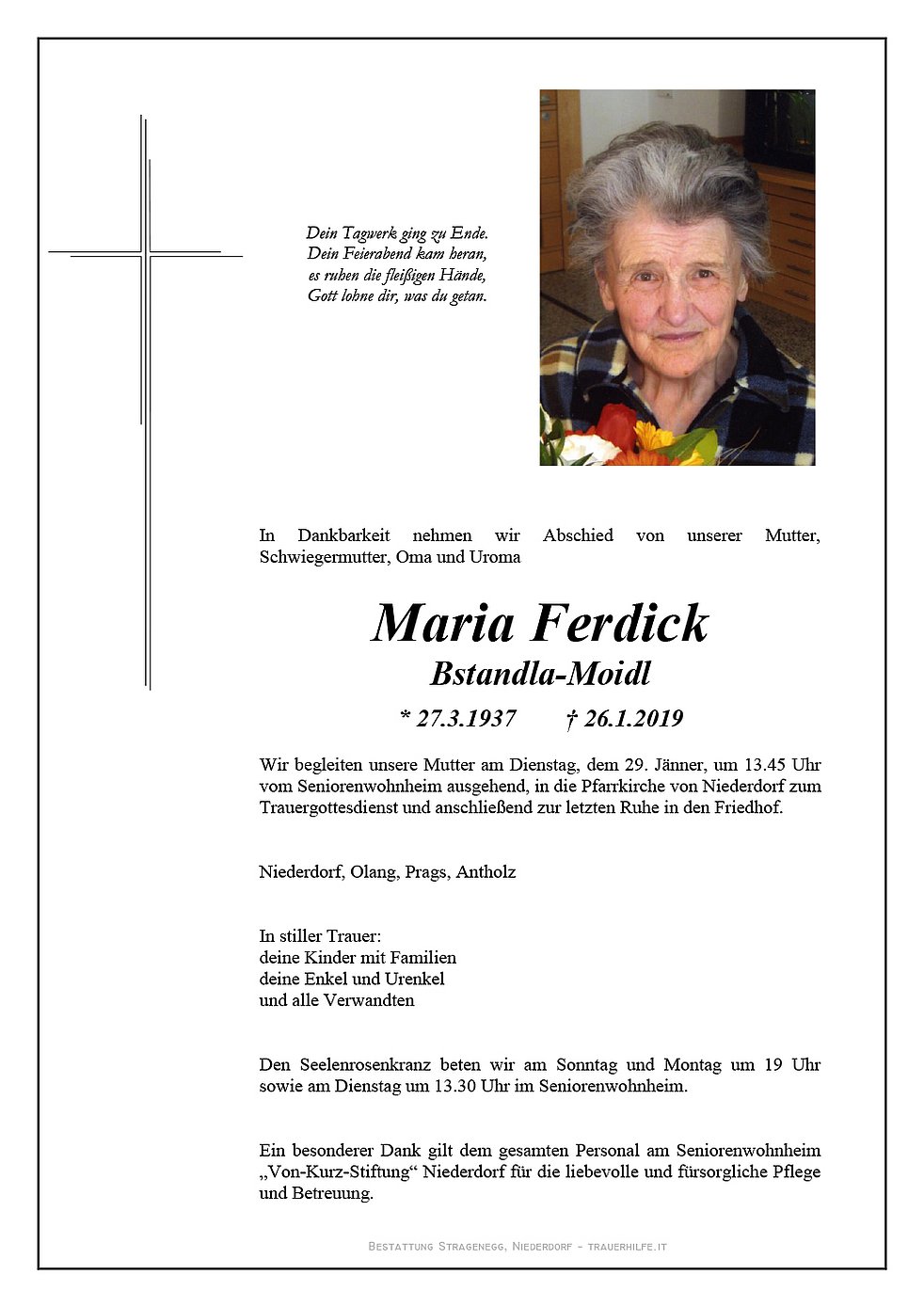 Wir begleiten unsere Mutter am Dienstag, dem 29. Jänner, um 13.45 Uhr vom Seniorenwohnheim ausgehend, in die Pfarrkirche von Niederdorf zum Trauergottesdienst und anschließend zur letzten Ruhe in den Friedhof.