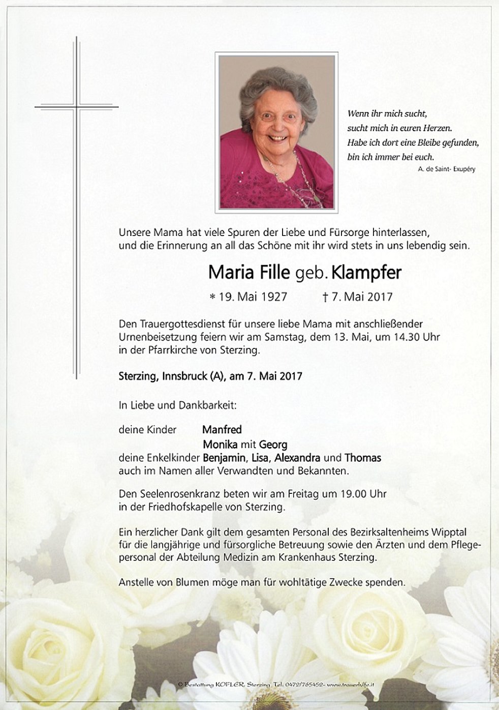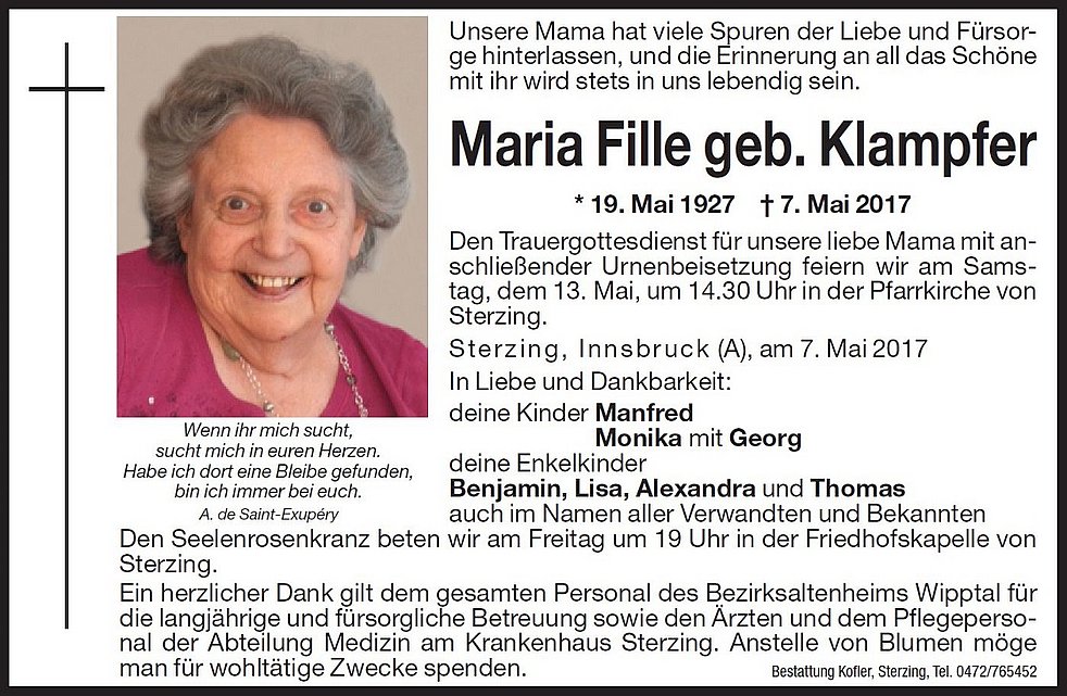 Den Trauergottesdienst für unsere liebe Mama mit anschließender Urnenbeisetzung feiern wir am Samstag, dem 13. Mai, um 14.30 Uhr in der Pfarrkirche von Sterzing.