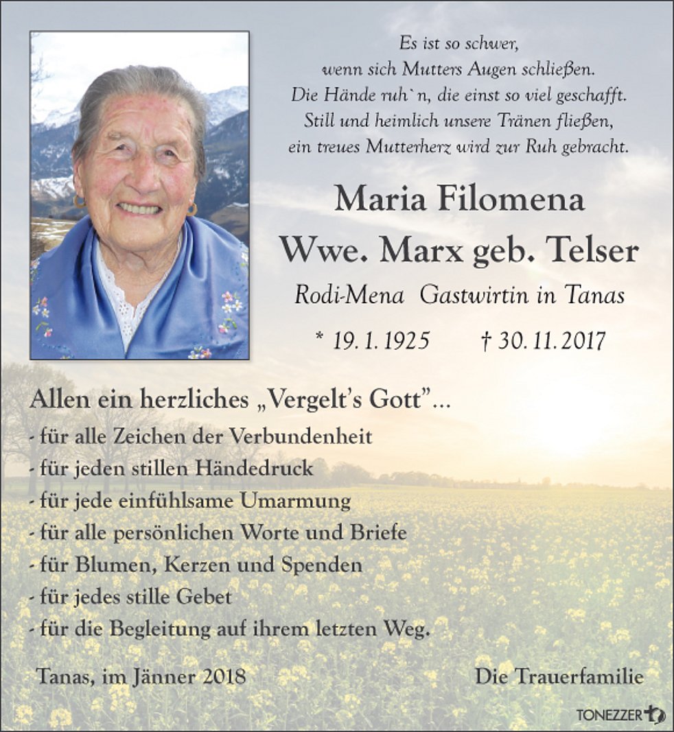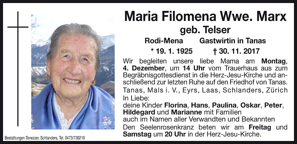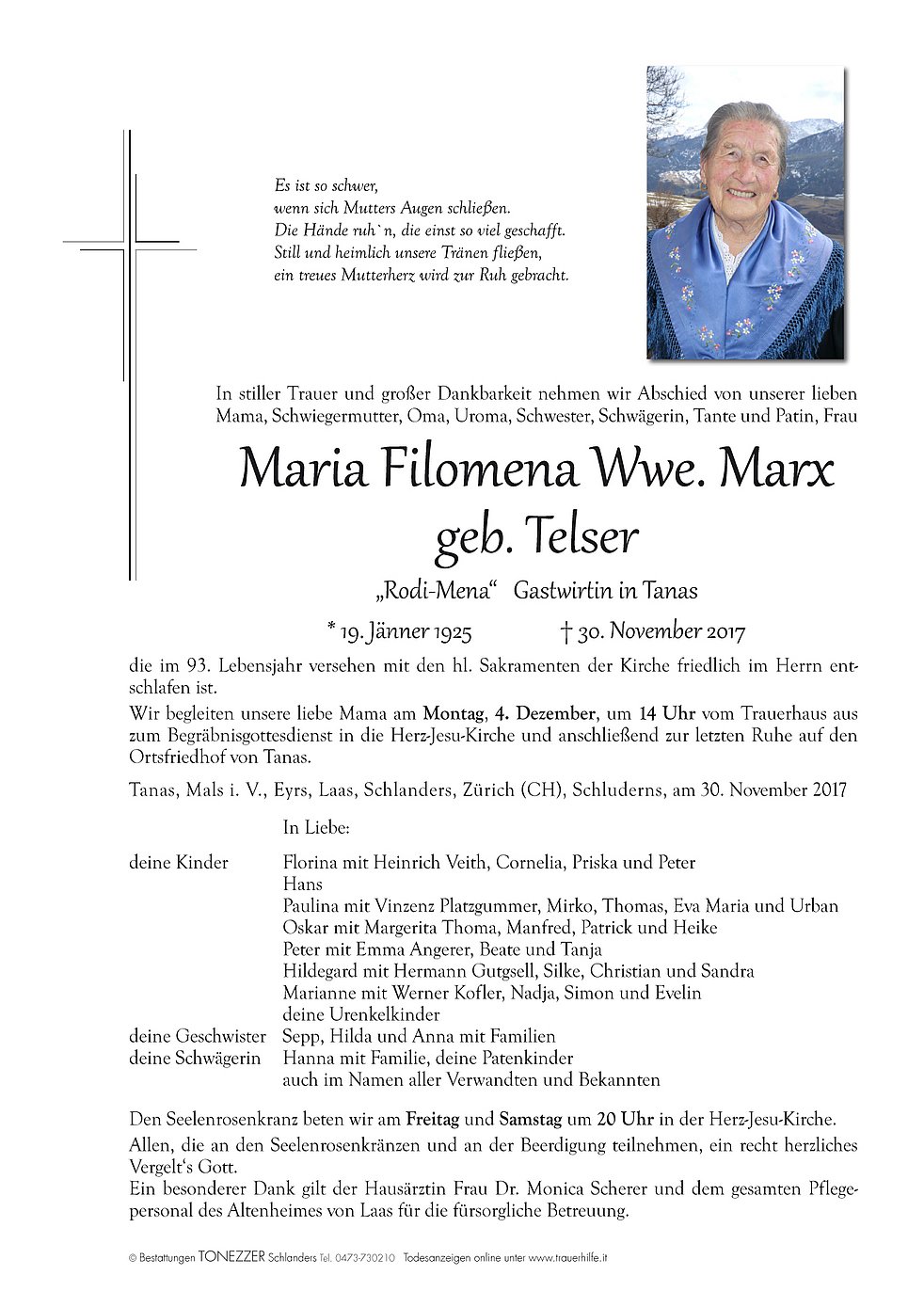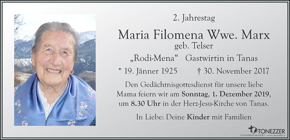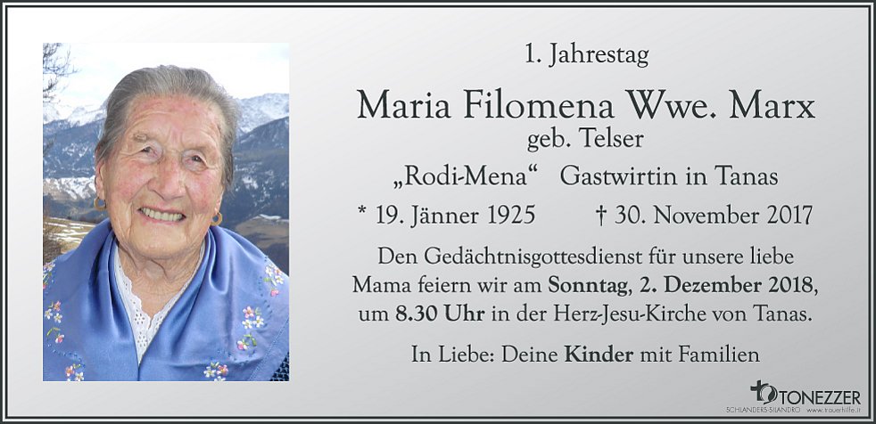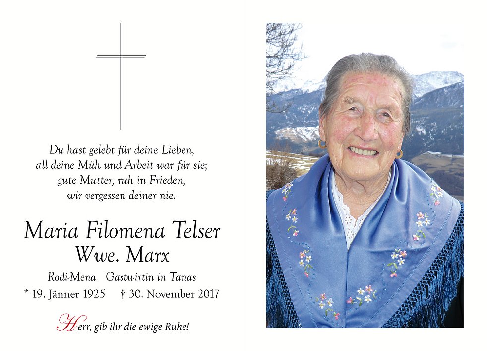 Wir begleiten unsere liebe Mama am Montag, 4. Dezember, um 14 Uhr vom Trauerhaus aus zum Begräbnisgottesdienst in die Herz-Jesu-Kirche und anschließend zur letzten Ruhe auf den Ortsfriedhof von Tanas.