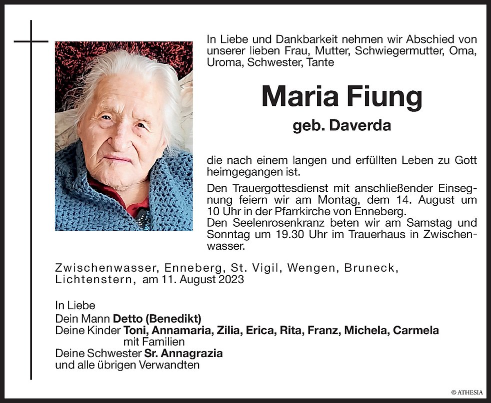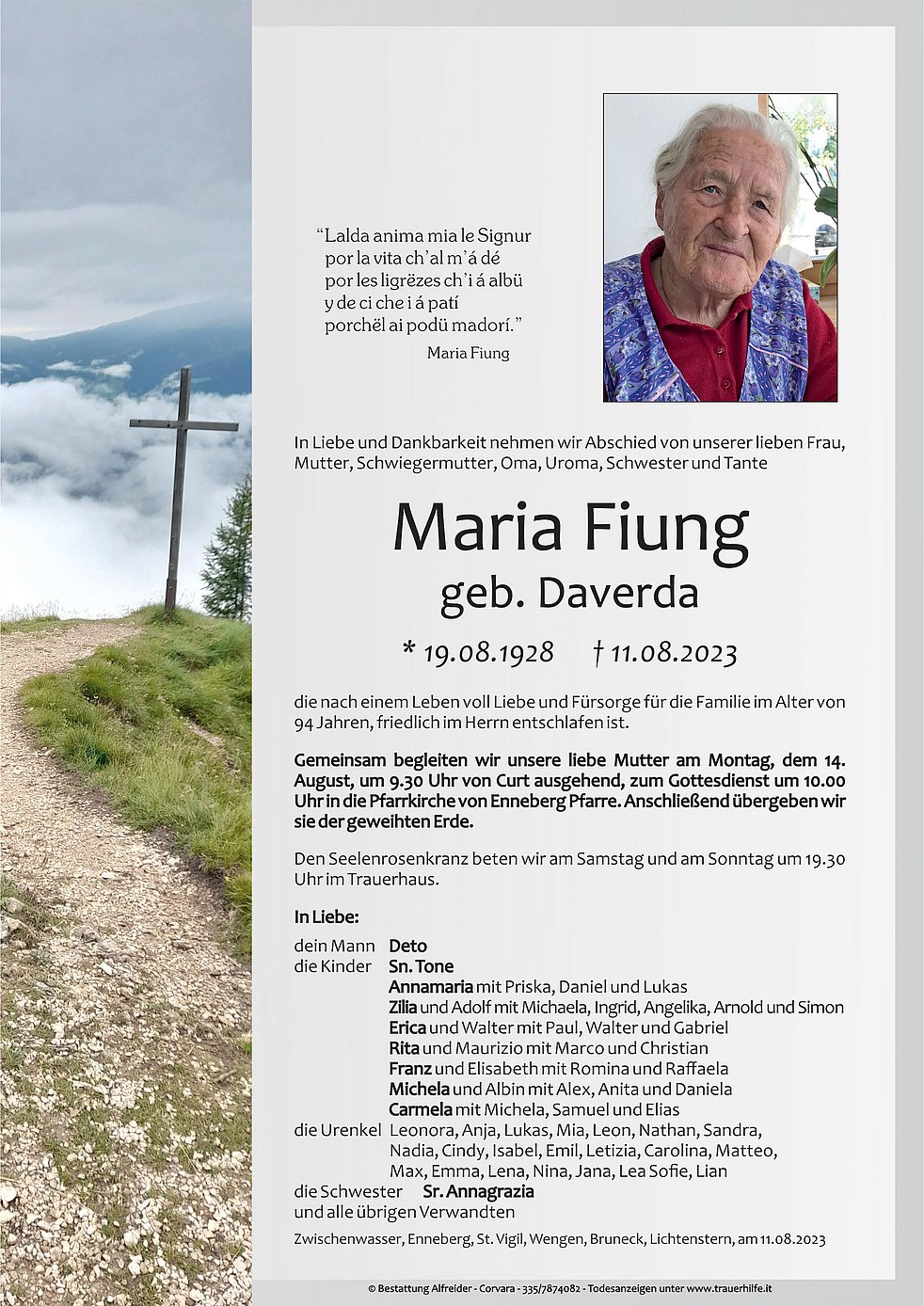 Im Namen der Katholischen Fraubenbewegung Kaltern übermitteln wir dir liebe Anna Maria und lieber Toni unser aufrichtiges Mitgefühl und unsere Anteilnahme am Tode eurer lieben Mutter.