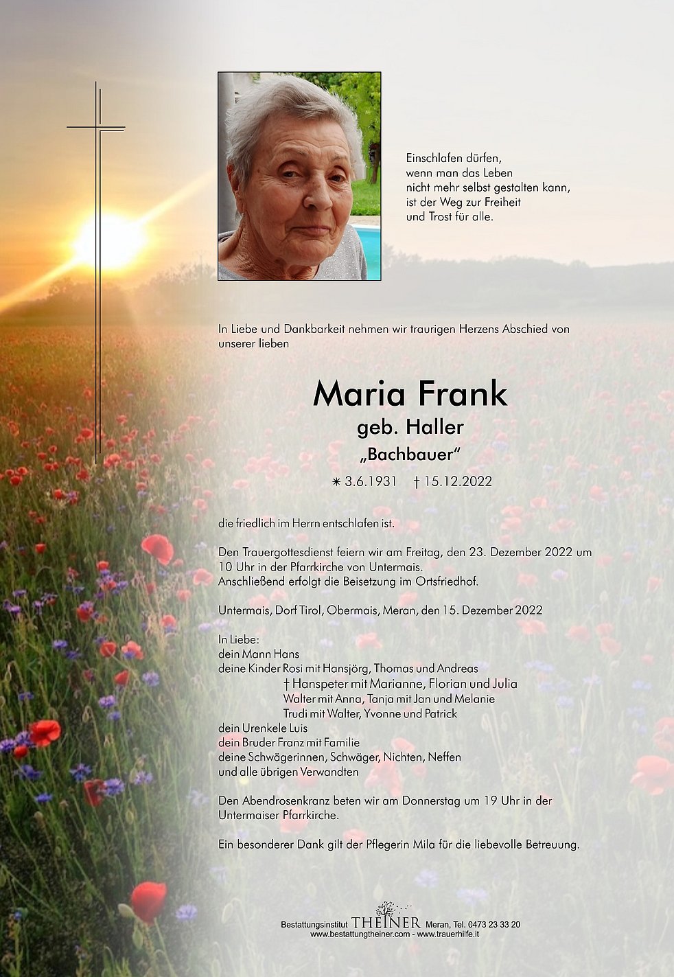 Den Trauergottesdienst feiern wir am Freitag, den 23. Dezember 2022 um 10 Uhr in der Pfarrkirche von Untermais.