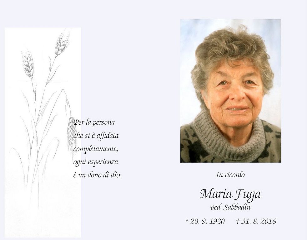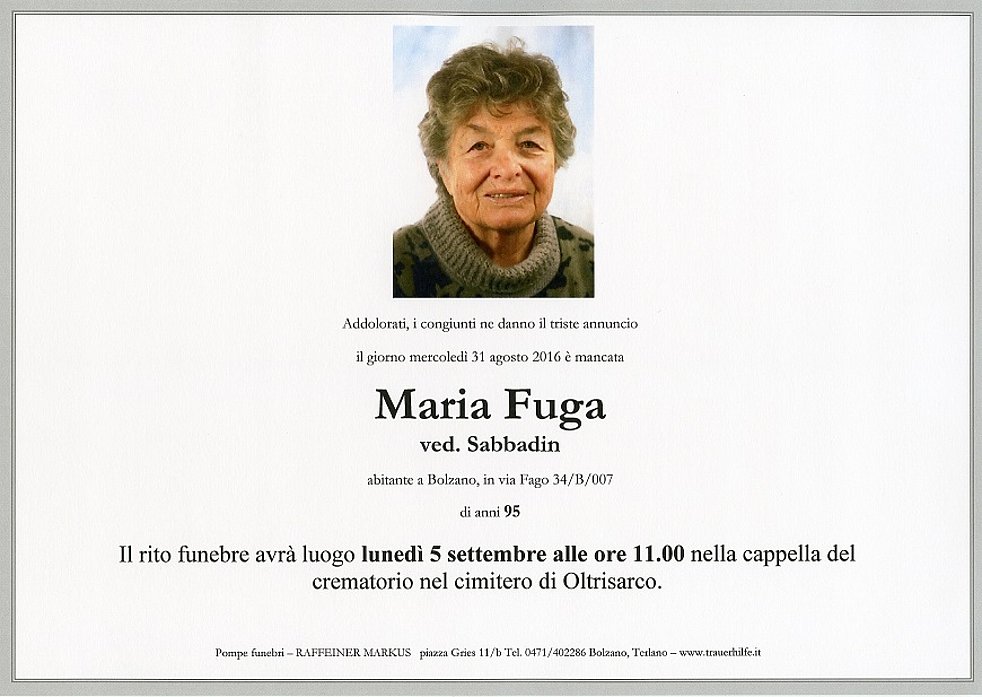 Il rito funebre avrà luogo lunedì 5 settembre alle ore 11.00 nella cappella del crematorio nel cimitero di Oltrisarco.