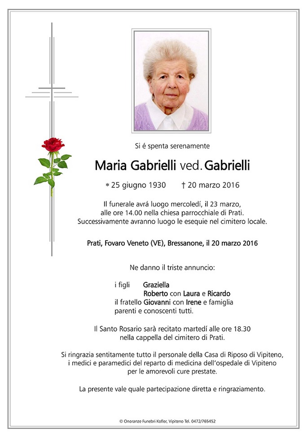 Si ringrazia sentitamente tutto il personale della Casa di Riposo di Vipiteno, i medici e paramedici del reparto di medicina dell‘ospedale di Vipiteno per le amorevoli cure prestate.