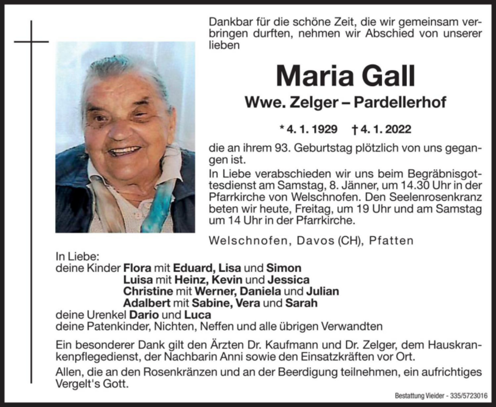 Ein besonderer Dank gilt den Ärzten Dr. Kaufmann und Dr. Zelger, dem Hauskrankenpflegedienst, der Nachbarin Anni sowie den Einsatzkräften vor Ort.