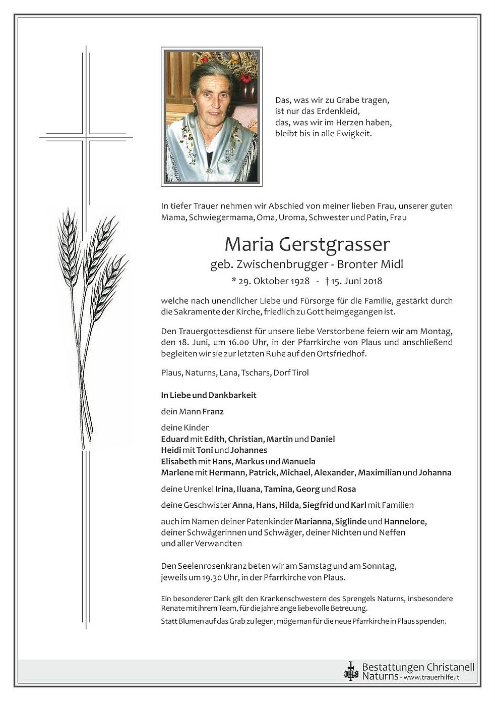 Den Trauergottesdienst für unsere liebe Verstorbene feiern wir am Montag, den 18. Juni, um 16.00 Uhr, in der Pfarrkirche von Plaus und anschließend begleiten wir sie zur letzten Ruhe auf den Ortsfriedhof.