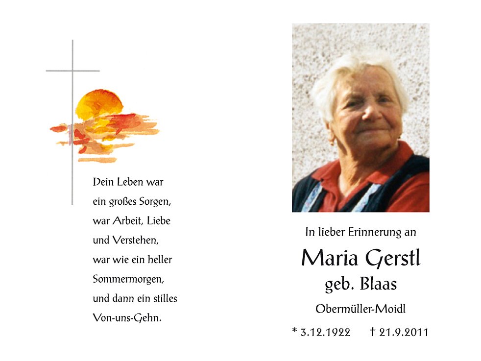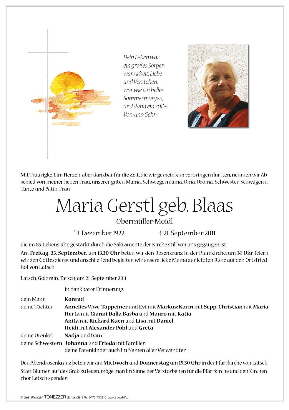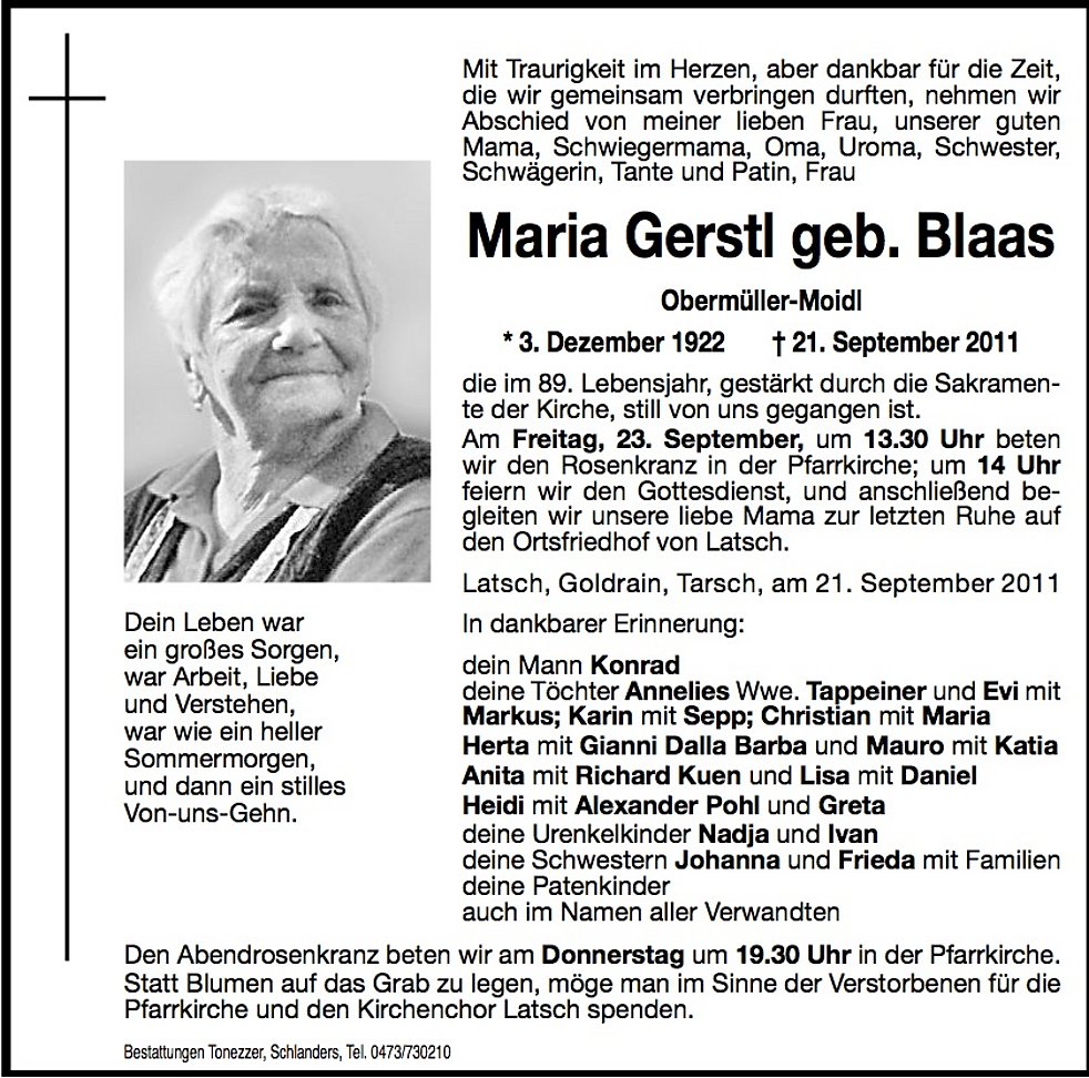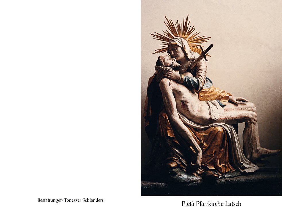 Am Freitag, 23. September, um 13.30 Uhr beten wir den Rosenkranz in der Pfarrkirche; um 14 Uhr feiern wir den Gottesdienst und anschließend begleiten wir unsere liebe Mama zur letzten Ruhe auf den Ortsfriedhof von Latsch.