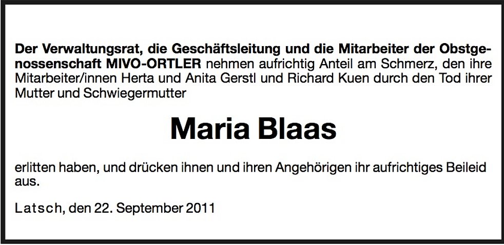 Statt Blumen auf das Grab zu legen, möge man im Sinne der Verstorbenen für die Pfarrkirche und den Kirchenchor Latsch spenden.