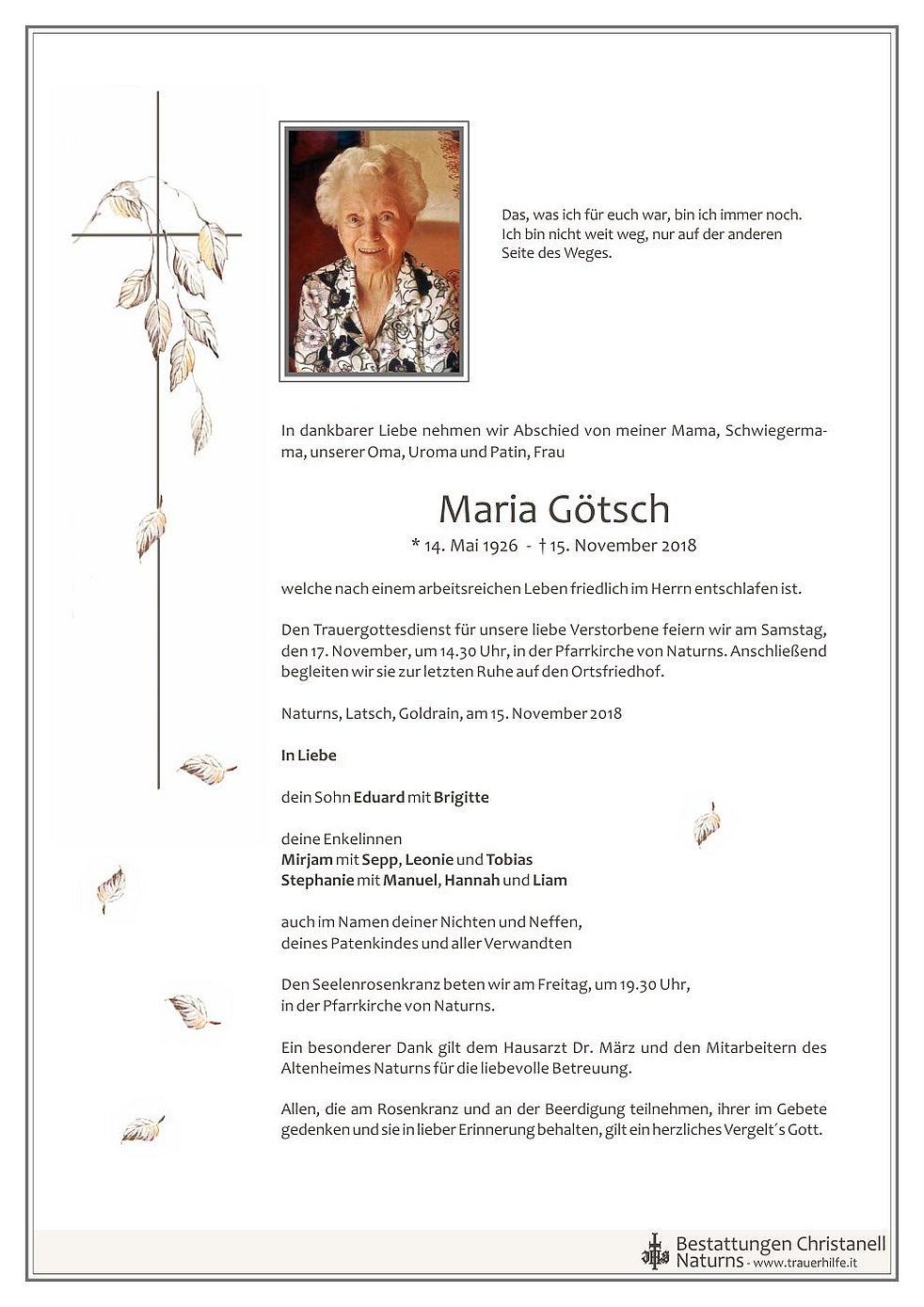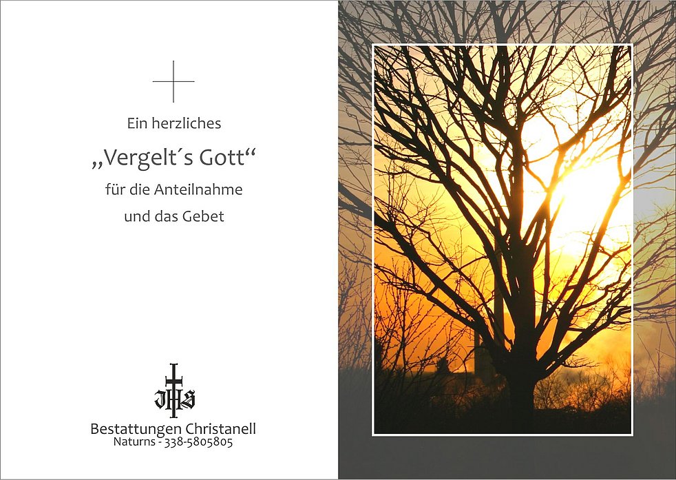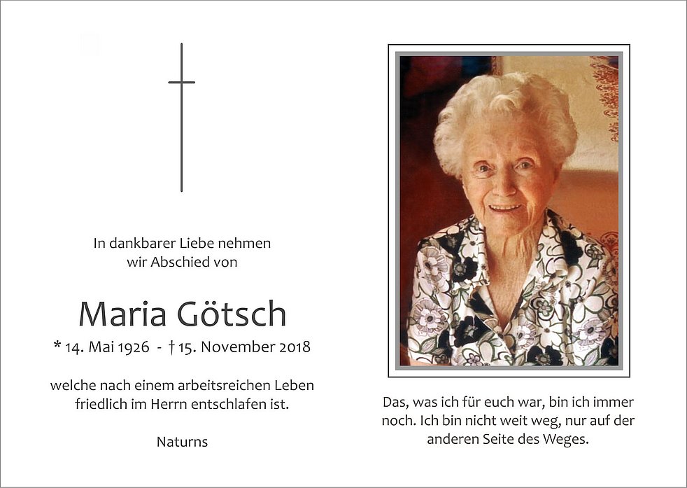 Den Trauergottesdienst für unsere liebe Verstorbene feiern wir am Samstag, den 17. November, um 14.30 Uhr, in der Pfarrkirche von Naturns. Anschließend begleiten wir sie zur letzten Ruhe auf den Ortsfriedhof.