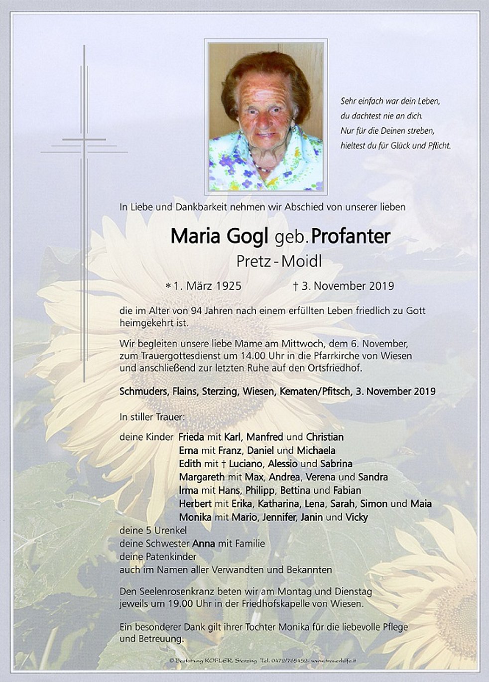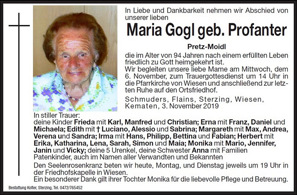 Wir begleiten unsere liebe Mame am Mittwoch, dem 6. November, zum Trauergottesdienst um 14.00 Uhr in die Pfarrkirche von Wiesen und anschließend zur letzten Ruhe auf den Ortsfriedhof.