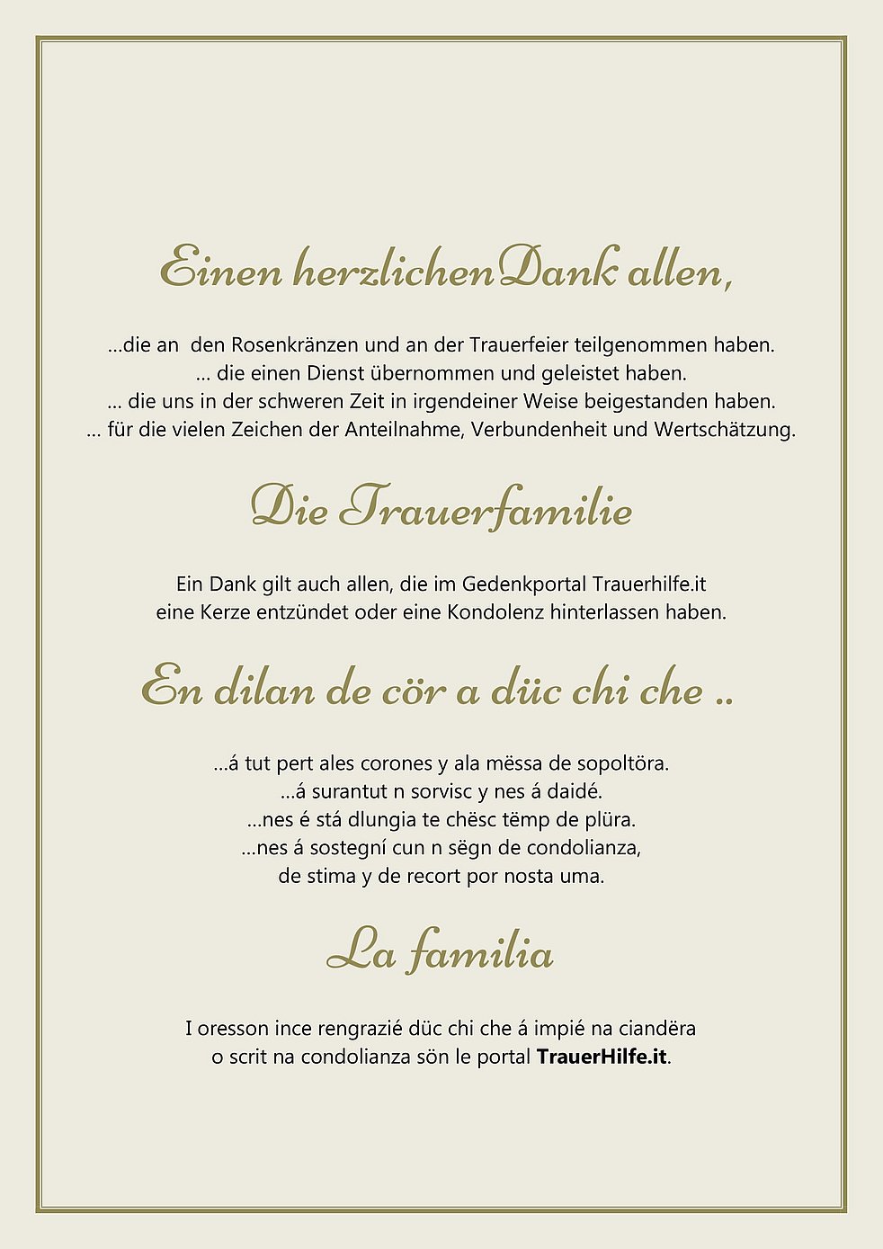 Den Trauergottesdienst für unsere liebe Mutter und Oma feiern wir am Donnerstag, dem 29. Juli, um 14.30 Uhr in der Pfarrkirche von Untermoi.