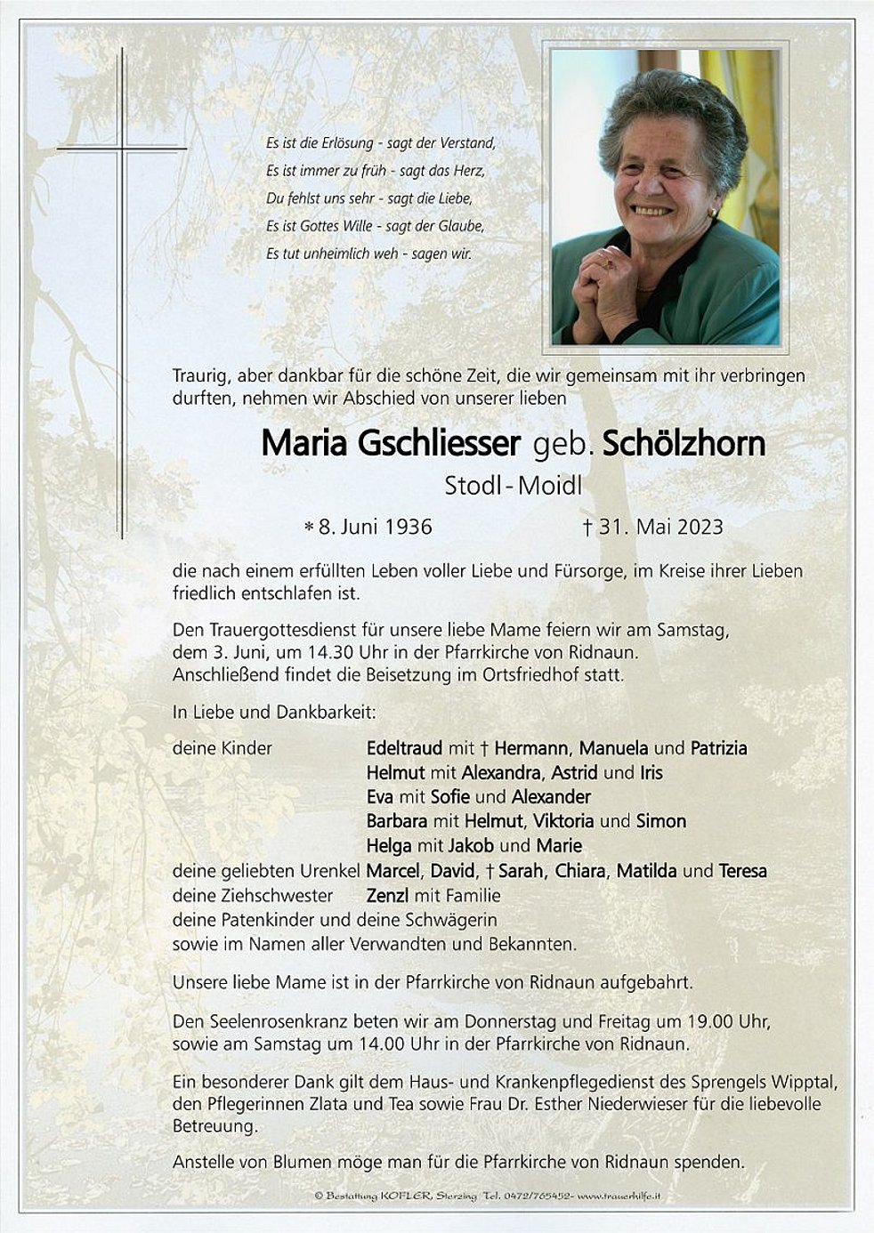 Den Trauergottesdienst für unsere liebe Mame feiern wir am Samstag, dem 3. Juni, um 14.30 Uhr in der Pfarrkirche von Ridnaun. Anschließend findet die Beisetzung im Ortsfriedhof statt.