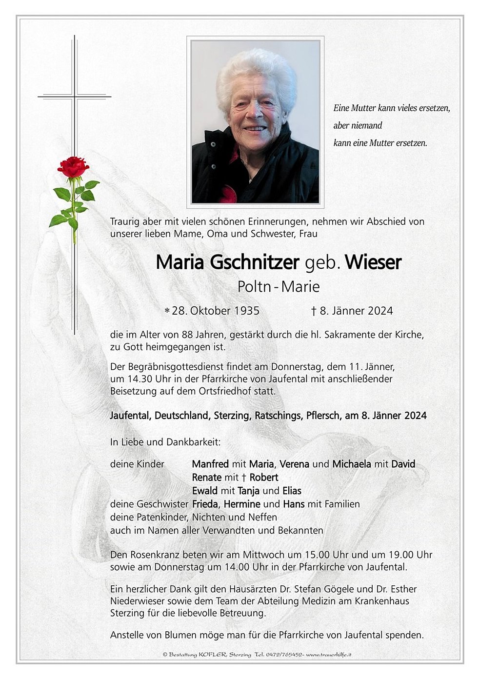 Der Begräbnisgottesdienst findet am Donnerstag, dem 11. Jänner, um 14.30 Uhr in der Pfarrkirche von Jaufental mit anschließender Beisetzung auf dem Ortsfriedhof statt.