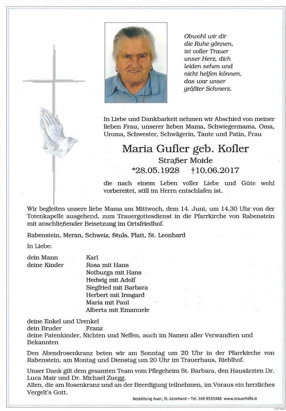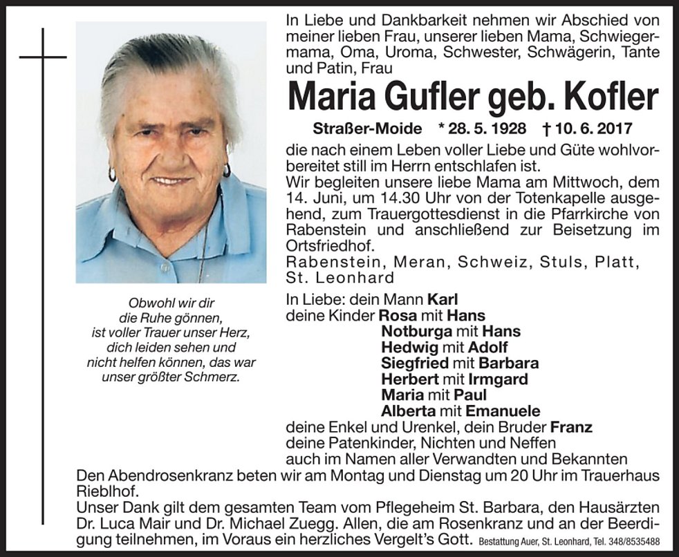 Wir begleiten unsere liebe Mama am Mittwoch, dem 14. Juni, um 14.30 Uhr von der Totenkapelle ausgehend, zum Trauergottesdienst in die Pfarrkirche von Rabenstein mit anschließender Beisetzung im Ortsfriedhof.