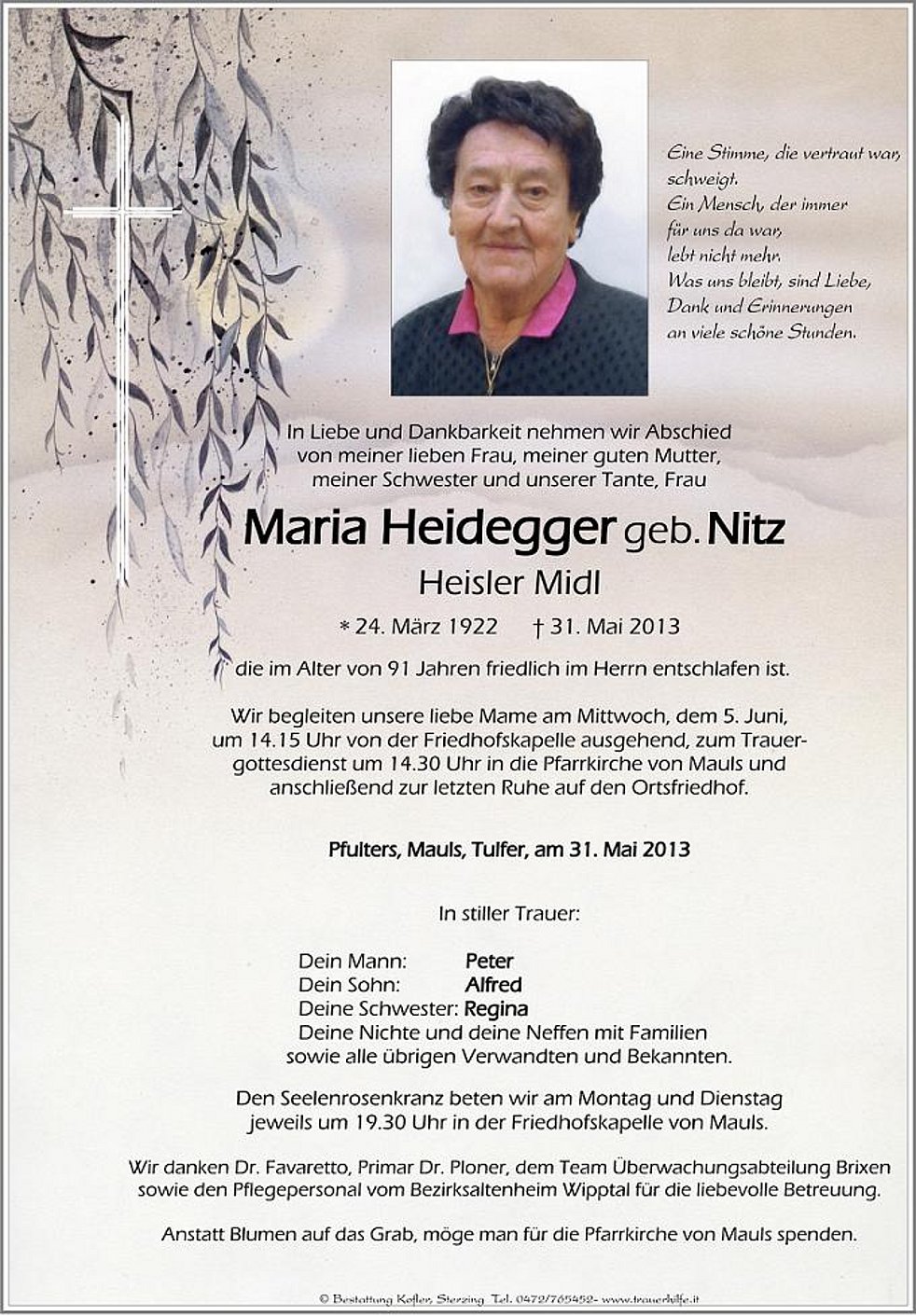 Wir begleiten unsere liebe Mame am Mittwoch, dem 5. Juni, um 14.15 Uhr von der Friedhofskapelle ausgehend, zum Trauergottesdienst um 14.30 Uhr in die Pfarrkirche von Mauls und anschließend zur letzten Ruhe auf den Ortsfriedhof.