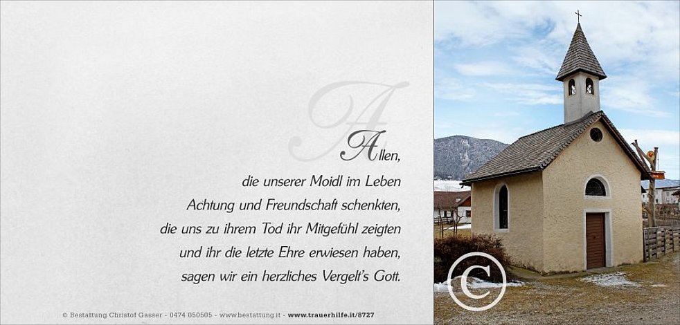Vergelt‘s Gott allen, die an den Seelenrosenkränze und an der Beerdigung von unserer lieben Moidl teilnehmen.