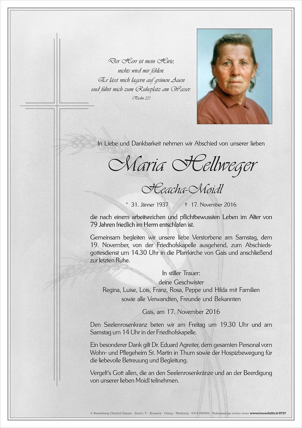 Gemeinsam begleiten wir unsere liebe Verstorbene am Samstag, dem 19. November, von der Friedhofskapelle ausgehend, zum Abschiedsgottesdienst um 14.30 Uhr in die Pfarrkirche von Gais und anschließend zur letzten Ruhe.
