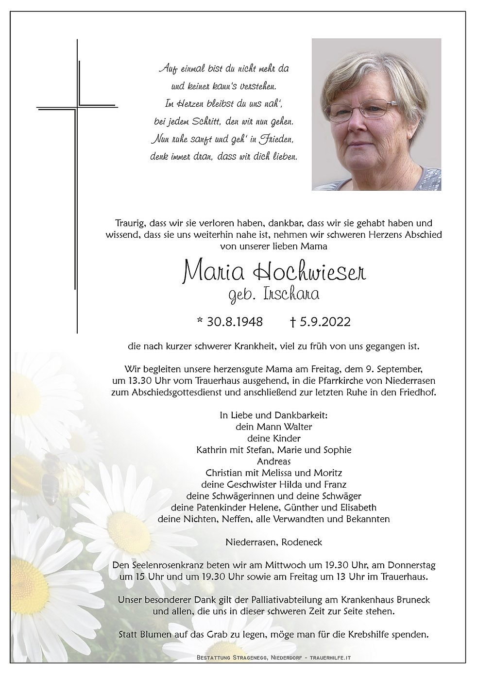Wir begleiten unsere herzensgute Mama am Freitag, dem 9. September, um 13.30 Uhr vom Trauerhaus ausgehend, in die Pfarrkirche von Niederrasen zum Abschiedsgottesdienst und anschließend zur letzten Ruhe in den Friedhof.