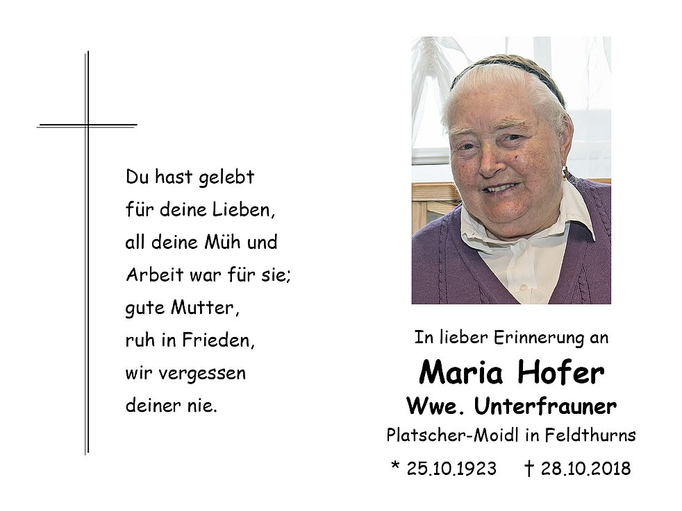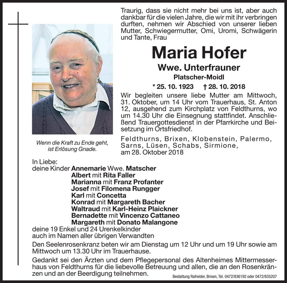 Wir begleiten unsere liebe Mutter am Mittwoch, 31. Oktober, um 14 Uhr vom Trauerhaus, St. Anton 12, ausgehend zum Kirchplatz von Feldthurns, wo um 14.30 Uhr die Einsegnung stattfindet. Anschließend Trauergottesdienst in der Pfarrkirche und Beisetzung im Ortsfriedhof.