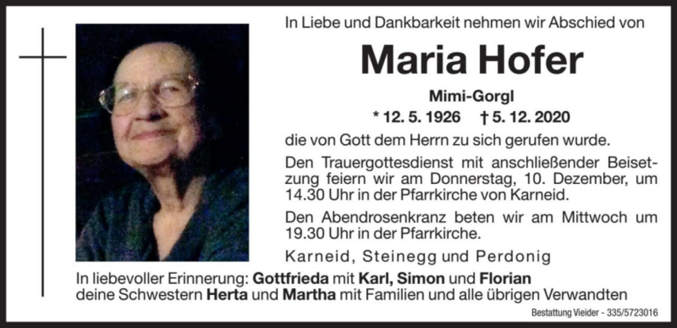Den Trauergottesdienst mit anschließender Beisetzung feiern wir am Donnerstag, 10. Dezember, um 14.30 Uhr in der Pfarrkirche von Karneid.