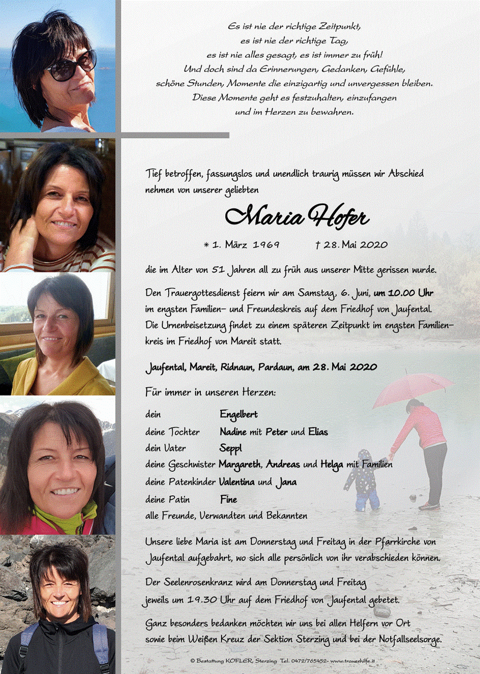 Den Trauergottesdienst feiern wir am Samstag, 6. Juni, um 10.00 Uhr im engsten Familien- und Freundeskreis auf dem Friedhof von Jaufental.