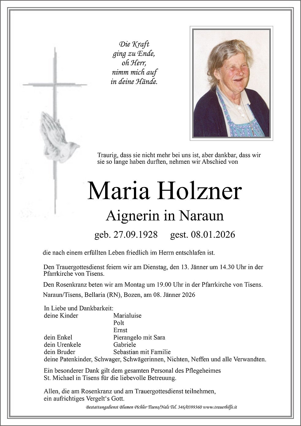 Begräbnisgottesdienst: 13.01. - 14:30 Uhr Pfarrkirche Tisens