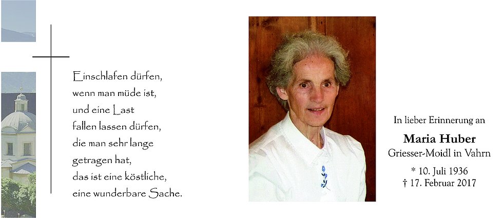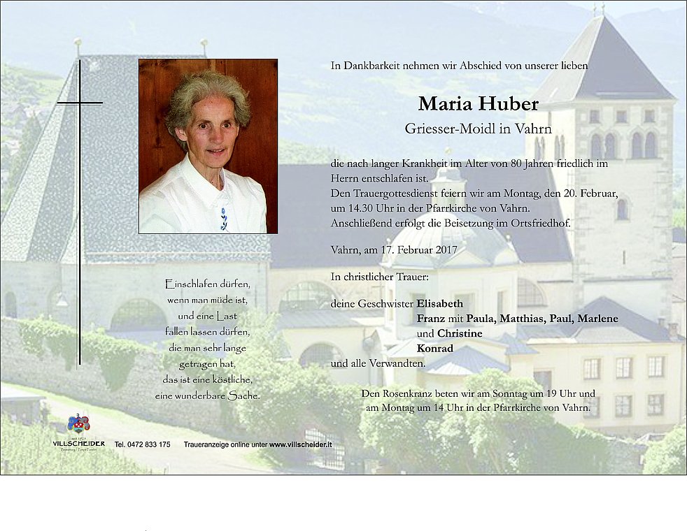 Den Trauergottesdienst feiern wir am Montag, den 20. Februar, um 14.30 Uhr in der Pfarrkirche von Vahrn.