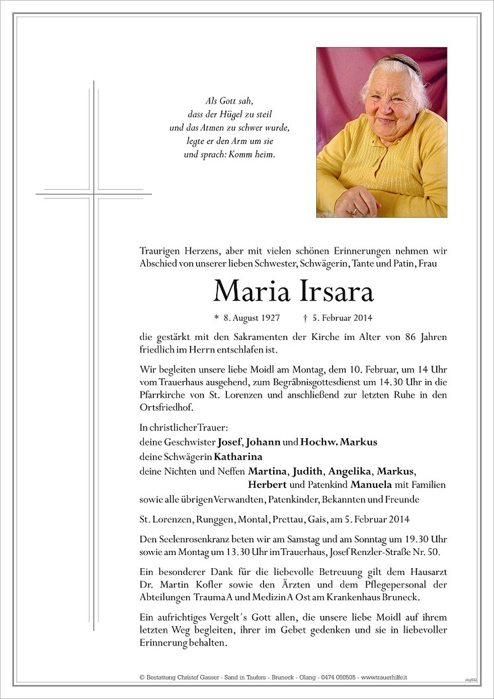 Wir begleiten unsere liebe Moidl am Montag, dem 10. Februar, um 14 Uhr vom Trauerhaus ausgehend, zum Begräbnisgottesdienst um 14.30 Uhr in die Pfarrkirche von St. Lorenzen und anschließend zur letzten Ruhe in den Ortsfriedhof.