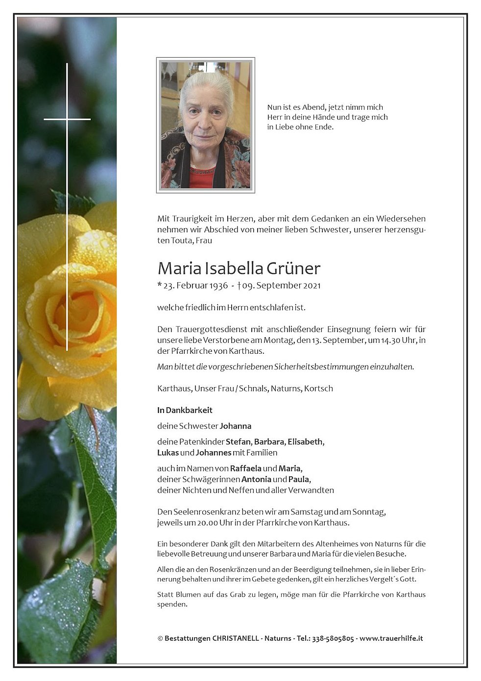 Den Trauergottesdienst mit anschließender Einsegnung feiern wir für unsere liebe Verstorbene am Montag, den 13. September, um 14.30 Uhr, in der Pfarrkirche von Karthaus.