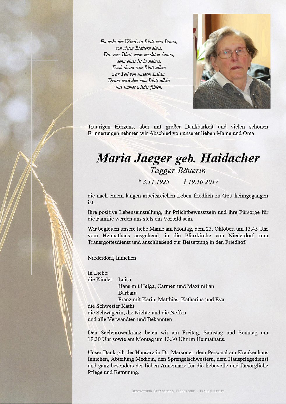Wir begleiten unsere liebe Mame am Montag, dem 23. Oktober, um 13.45 Uhr vom Heimathaus ausgehend, in die Pfarrkirche von Niederdorf zum Trauergottesdienst und anschließend zur Beisetzung in den Friedhof.