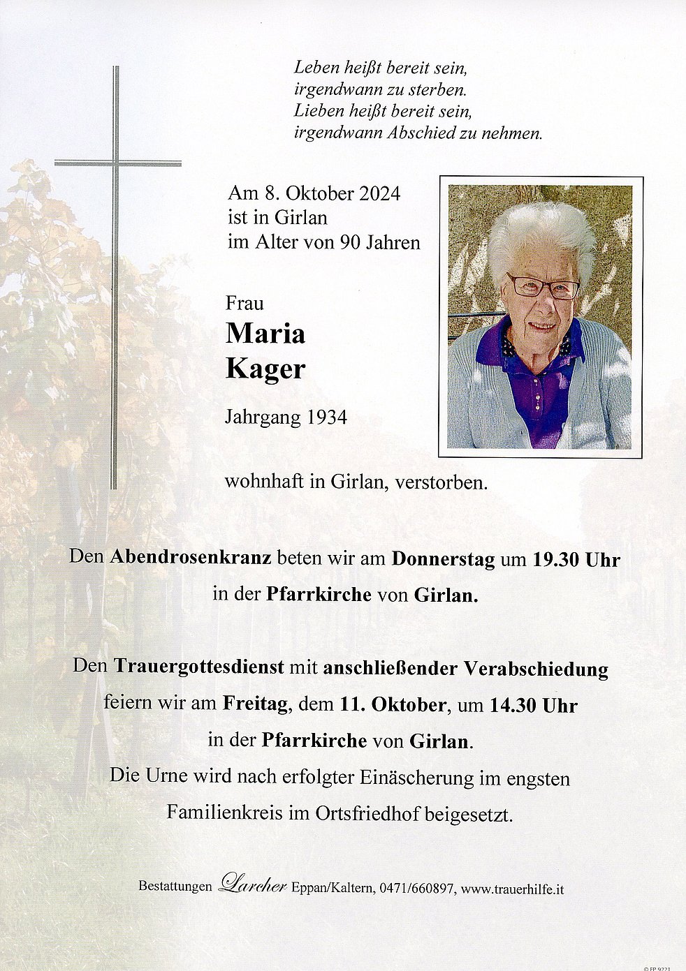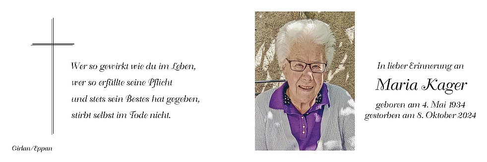 Im Sinne der Verstorbenen möge man für die Pfarrkirche Girlan (IBAN: IT16J0825558163000303000575) spenden.