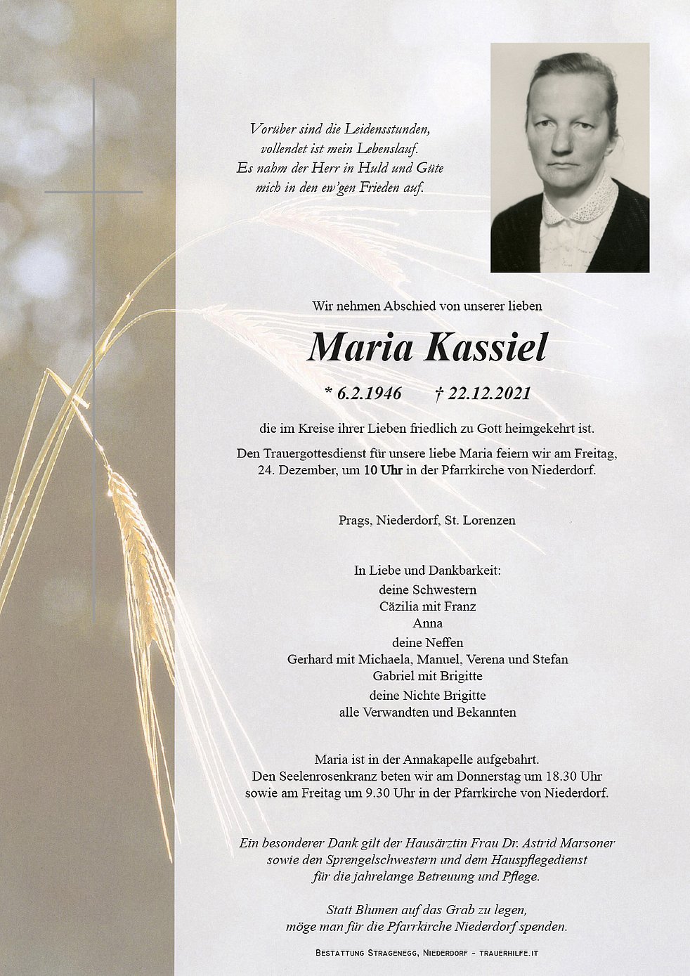 Den Trauergottesdienst für unsere liebe Maria feiern wir am Freitag, 24. Dezember, um 10 Uhr in der Pfarrkirche von Niederdorf.
