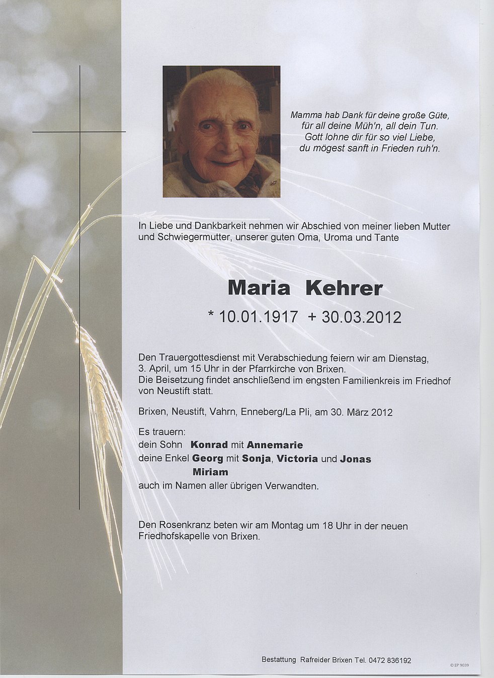 Gedankt sei dem Hausarzt Dr. Bruno Letrari für die langjährige ärztliche Betreuung und dem Pflegepersonal des III. Wohnbereiches des Bürgerheimes von Brixen für