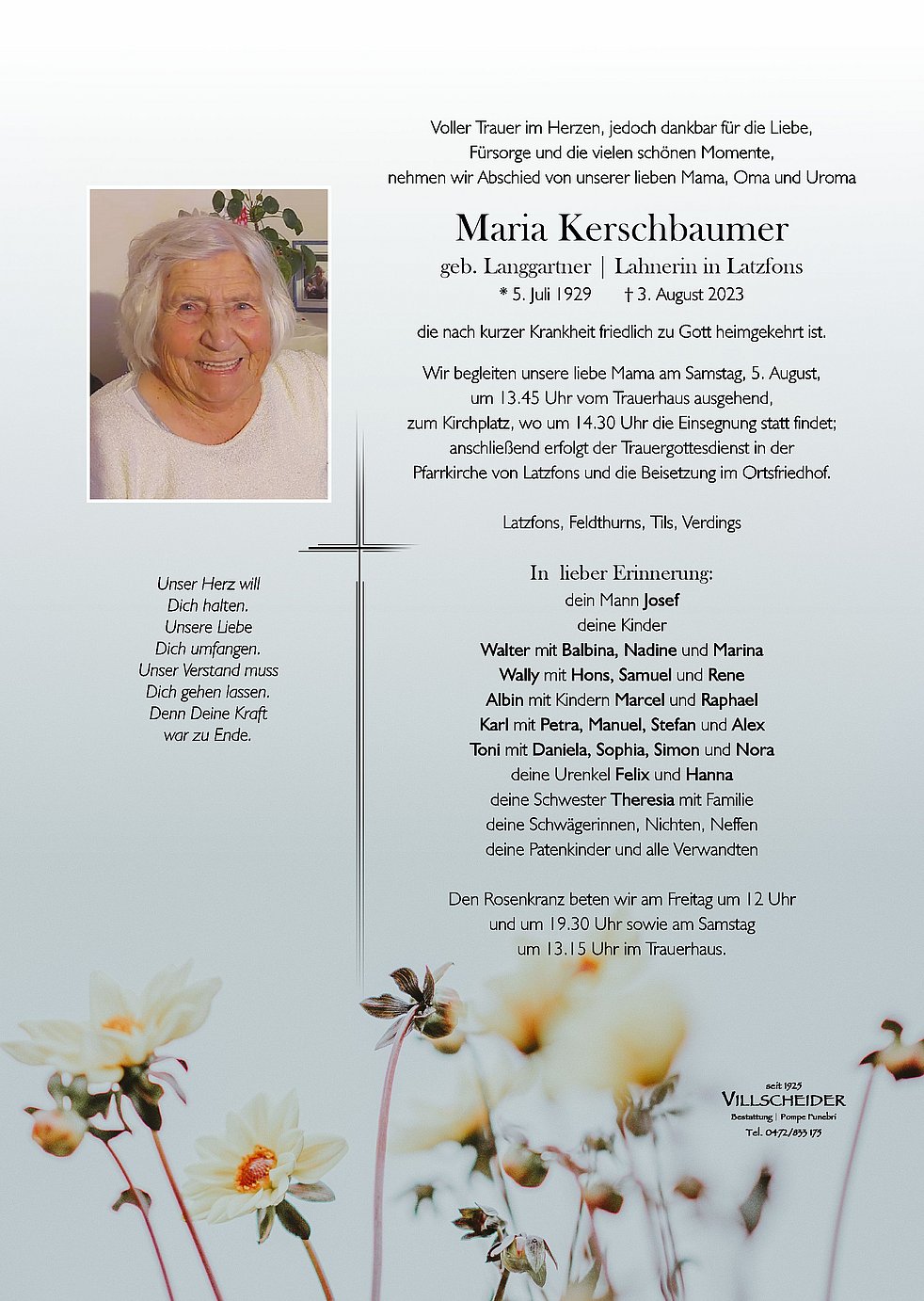 Gott gab euch eure Mutter als reichliches Glück. ihr legt sie nun still in seine Hand zurück Aufrichtiges Beileid, Schmied Rosl mit Familie