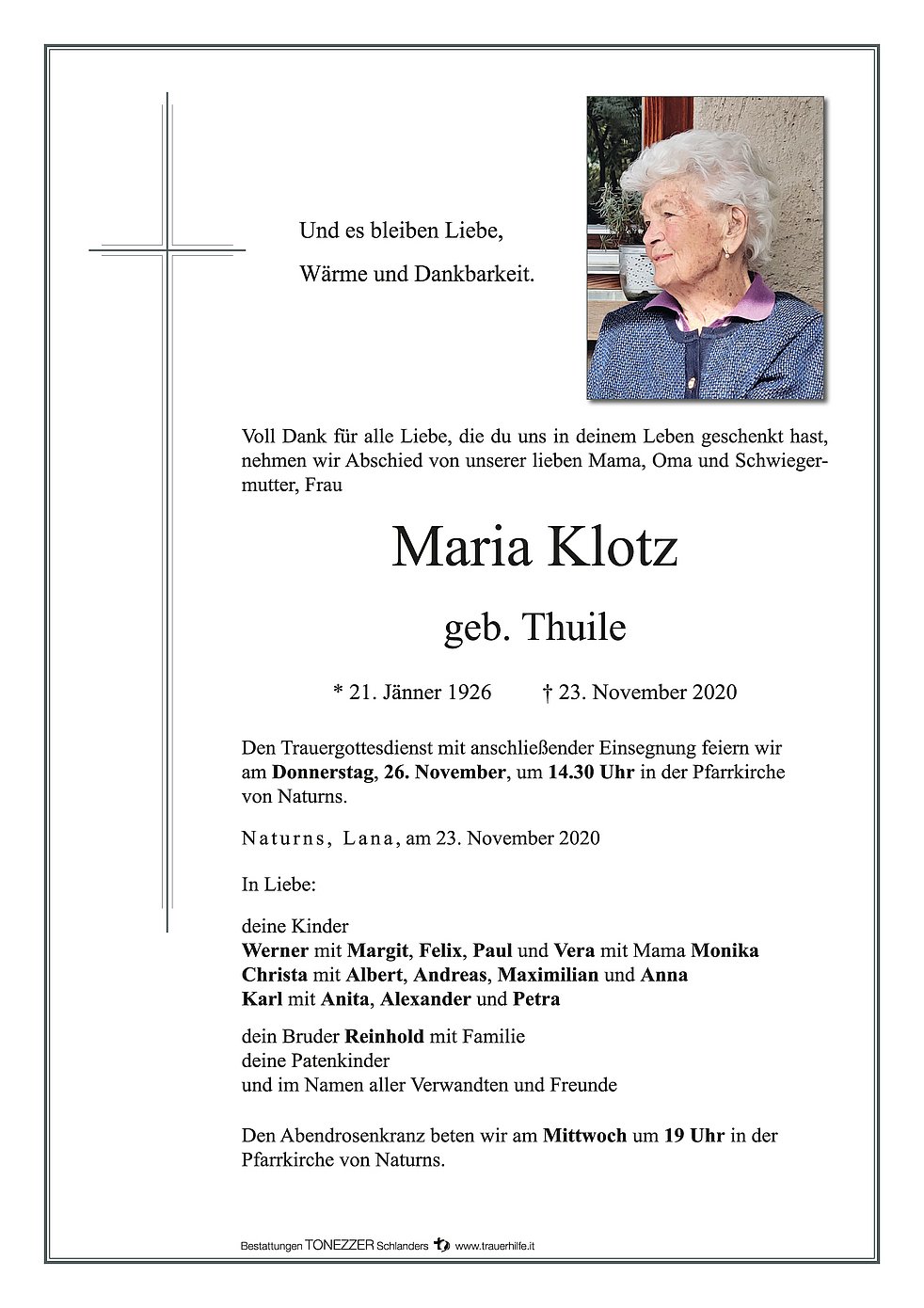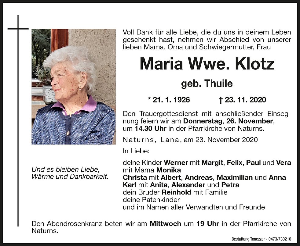 Den Trauergottesdienst mit anschließender Einsegnung feiern wir am Donnerstag, 26. November, um 14.30 Uhr in der Pfarrkirche von Naturns.